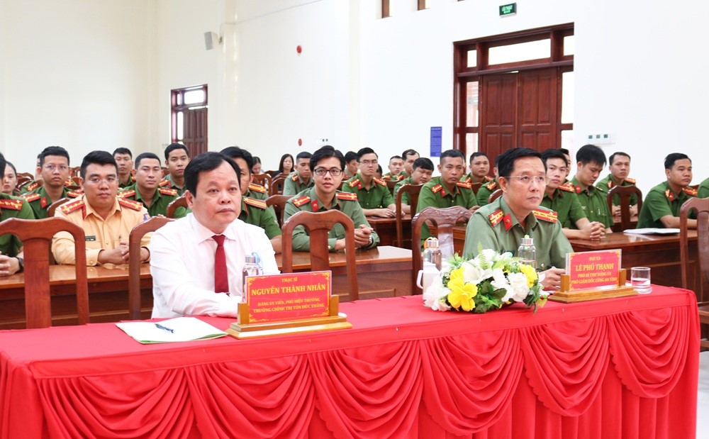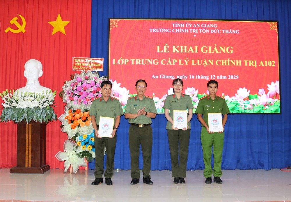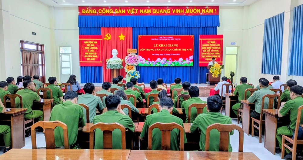 Sáng 16/12/2025, Trường Chính trị Tôn Đức Thắng phối hợp Công an tỉnh An Giang tổ chức Lễ khai giảng lớp trung cấp lý luận chính trị A102 (hệ tập trung). Đến dự buổi Lễ khai giảng có Đại tá Lê Phú Thạnh, Tỉnh uỷ viên, Phó Bí thư Đảng uỷ, Phó Giám đốc Công an tỉnh An Giang; đồng chí Nguyễn Thành Nhân, Phó Hiệu trưởng Trường Chính trị Tôn Đức Thắng.