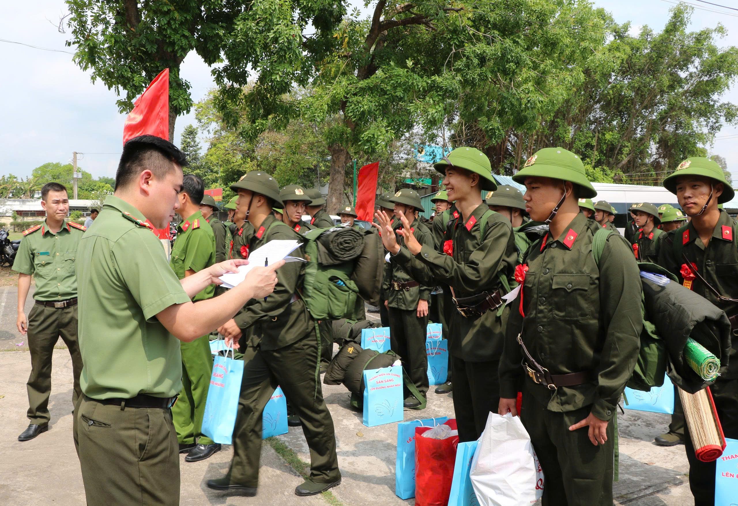 Cũng trong ngày 05/3/2026, tại Tiểu đoàn 3, Trung đoàn Cảnh sát Cơ động Tây Nam Bộ thuộc Bộ Tư lệnh Cảnh sát Cơ động, Công an tỉnh An Giang đã tổ chức Lễ giao nhận công dân thực hiện nghĩa vụ tham gia Công an nhân dân năm 2026 cho các đơn vị huấn luyện.