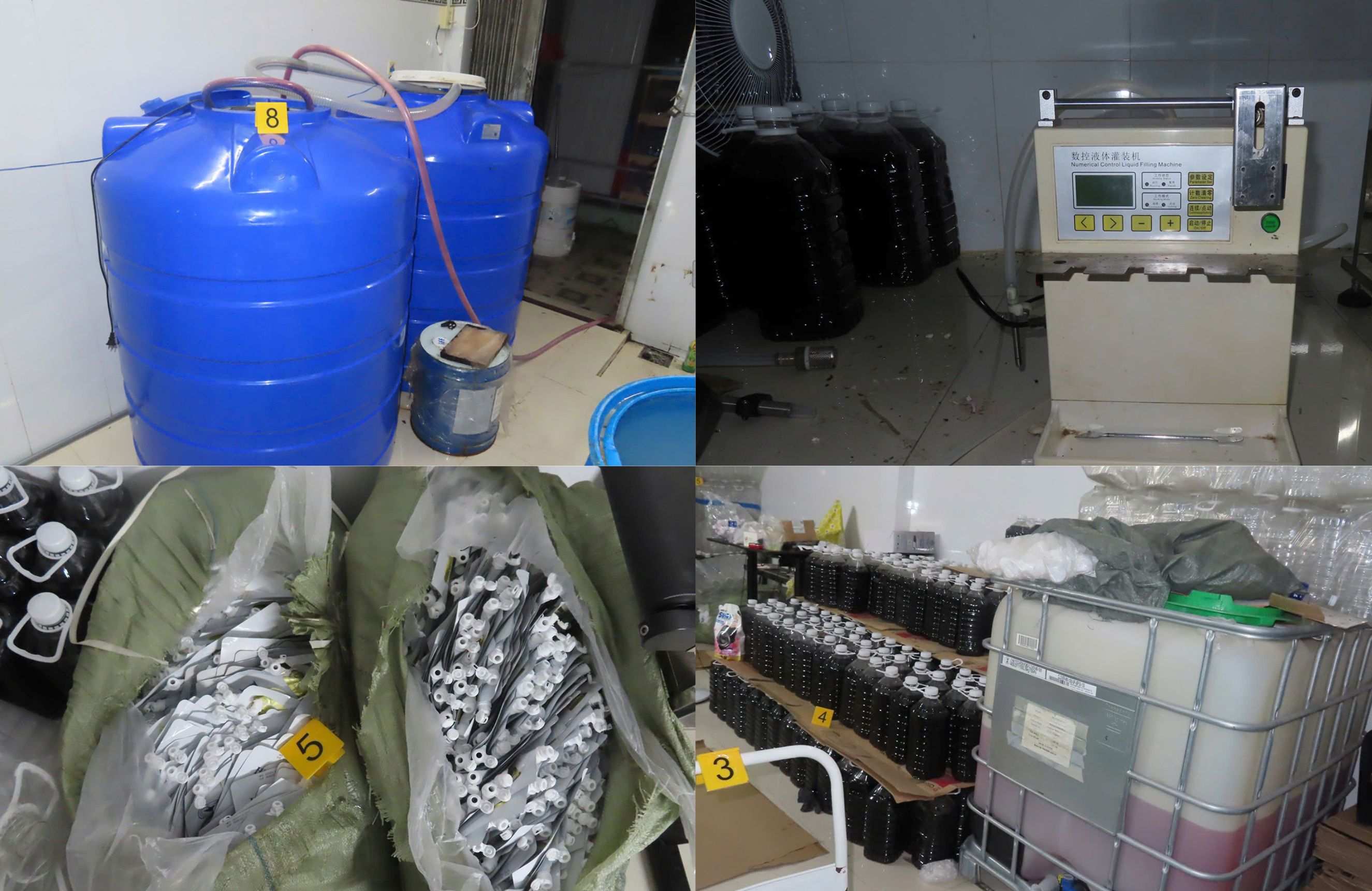 Trước đó, lực lượng Công an kiểm tra căn nhà do bị can Tâm thuê, bắt quả tang đối tượng đang sản xuất hàng giả. Tang vật thu giữ gồm: 469 can nhựa (4 lít/can) chứa dung dịch màu đen có mùi giống nước mắm; 4 thùng phuy nhựa chứa hơn 3.000 lít dung dịch có mùi giống nước giặt, xả vải; 120 túi nước xả vải mang nhãn hiệu Hygiene Thái Lan (1.100ml); 780 chai nhựa đen, 6.521 túi nhựa in nhãn hiệu Hygiene, 2 máy chiết rót và nhiều hóa chất khác.
