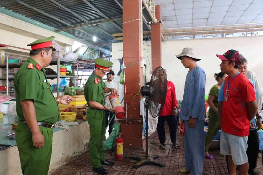 Cảnh sát PCCC và CNCH kiểm tra, hướng dẫn cách sử dụng, bảo trì, bảo dưỡng bình chữa cháy xách tay tại khu vực nấu ăn Đình Nguyễn Trung Trực