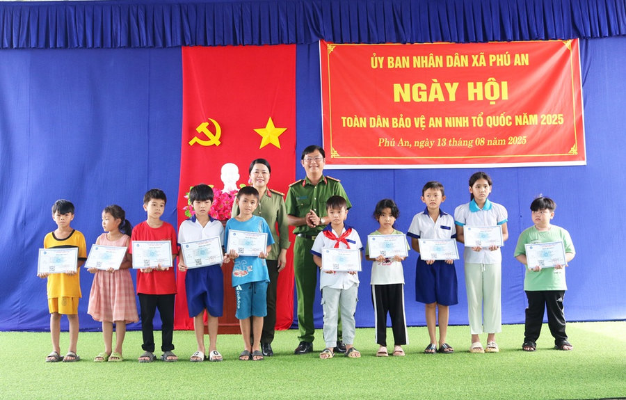 Ban Công đoàn Công an tỉnh và lãnh đạo Công an xã Phú An trao tặng thẻ bảo hiểm y tế cho các em học sinh