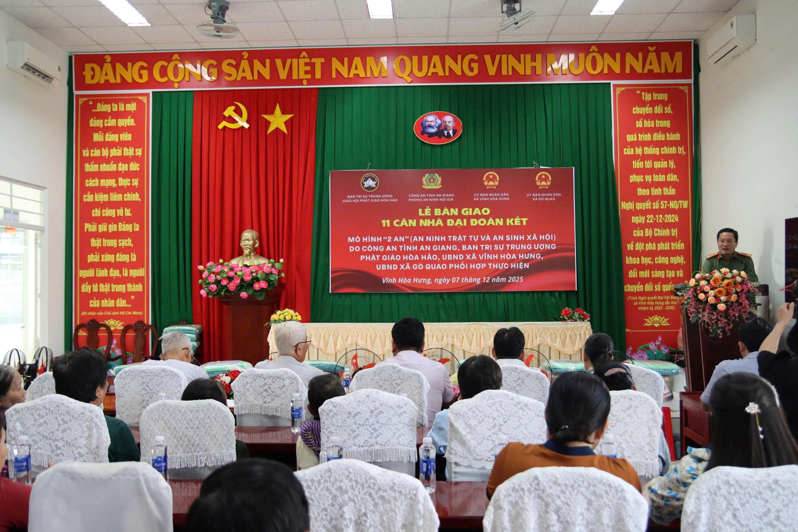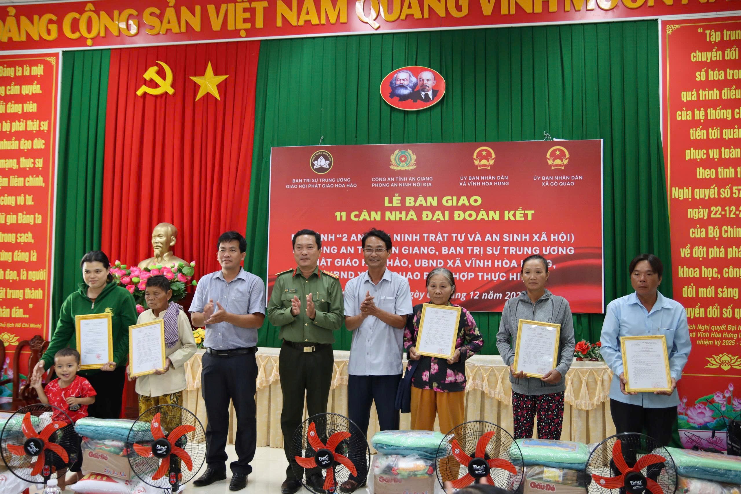 Ngày 07/12, Công an tỉnh An Giang phối hợp Ban Trị sự Trung ương Giáo hội Phật giáo Hòa Hảo, Ủy ban nhân dân xã Gò Quao và Vĩnh Hòa Hưng tổ chức lễ bàn giao 11 căn nhà Đại đoàn kết cho các hộ có hoàn cảnh khó khăn trên địa bàn.