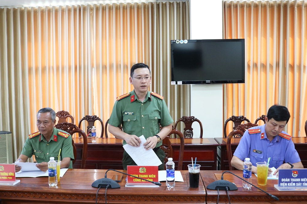 Đồng chí Trung tá Trương Văn Quốc, UVBTV Tỉnh đoàn, Trưởng Ban Thanh niên Công an tỉnh (Cụm Trưởng) phát biểu tại Hội nghị.