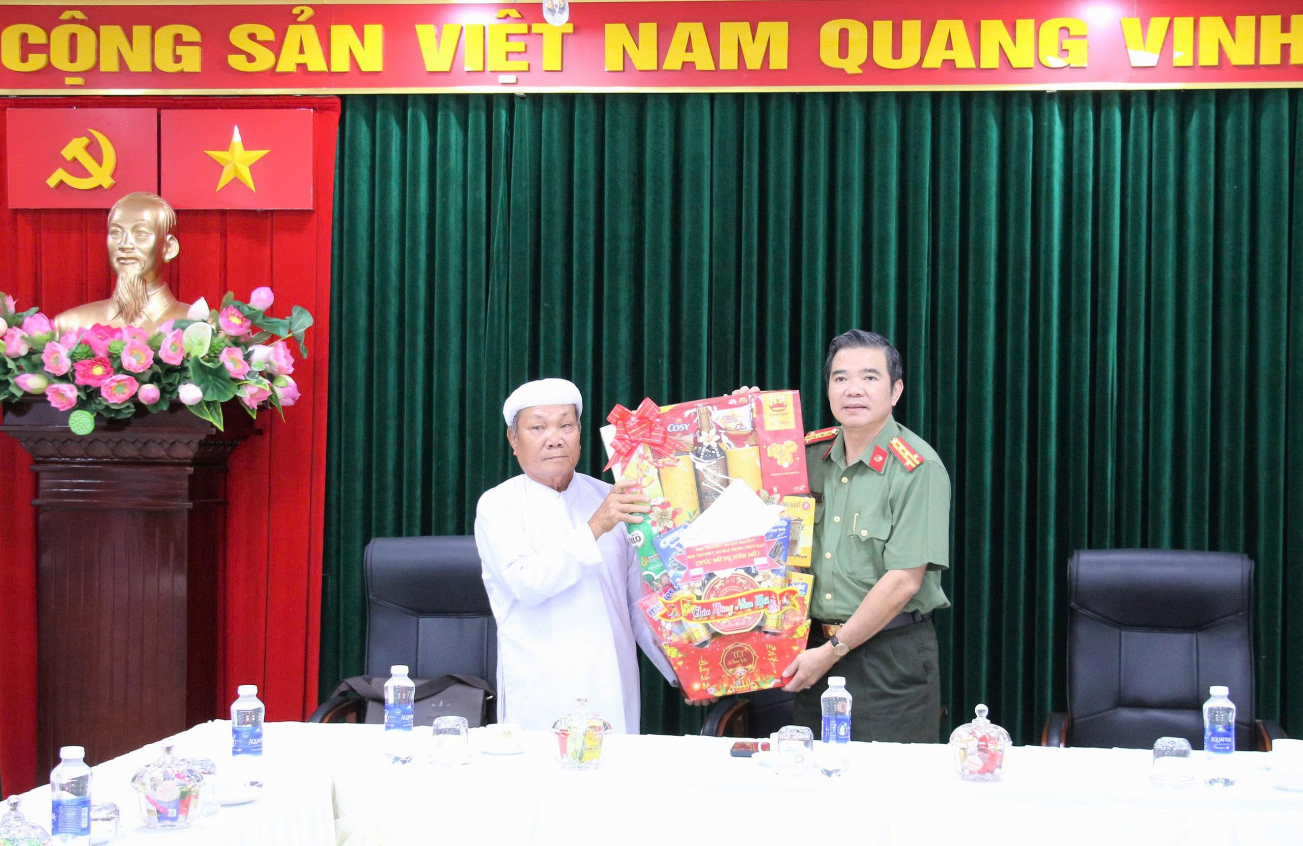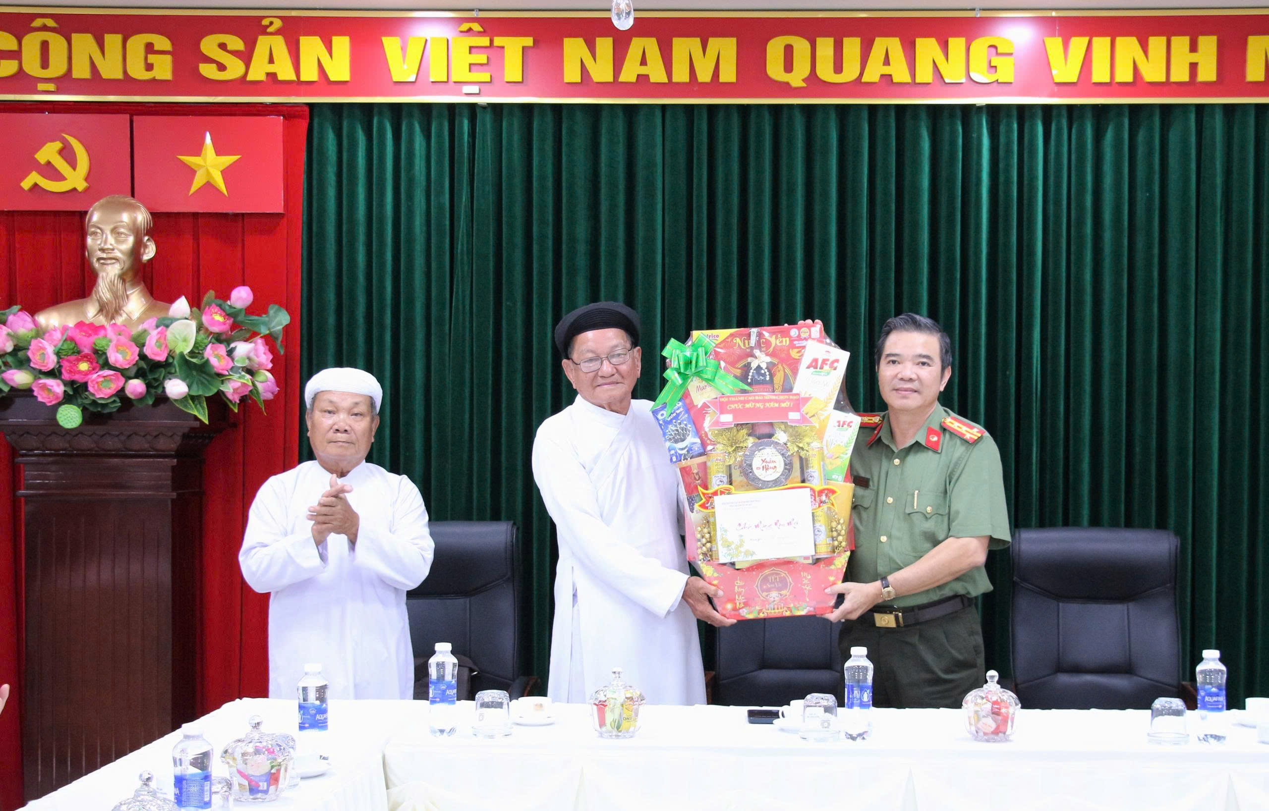 Ông Thái Tăng Tinh, Trưởng Ban Thường trực Hội thánh Cao Đài Minh Chơn Đạo tặng quà chúc Tết Công an tỉnh An Giang.