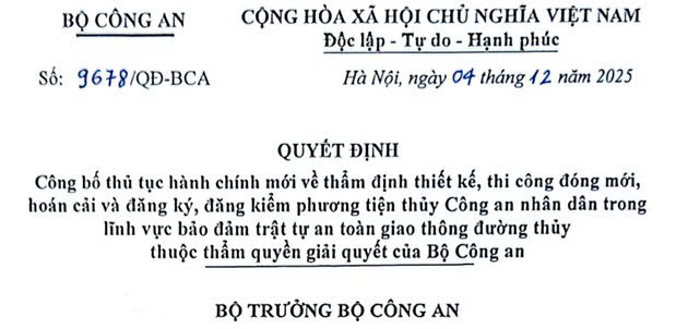 Ngày 04/12/2025, Bộ trưởng Bộ Công an ký ban hành Quyết định số 9678/QĐ-BCA về việc công bố thủ tục hành chính mới về thẩm định thiết kế, thi công đóng mới, hoán cải và đăng ký, đăng kiểm phương tiện thuỷ Công an nhân dân trong lĩnh vực bảo đảm trật tự an toàn giao thông đường thuỷ thuộc thẩm quyền giải quyết của Bộ Công an.