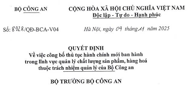 Bộ trưởng Bộ Công an công bố Quyết định số 8928/QĐ-BCA-V04 ngày 04/11/2025, về việc công bố thủ tục hành chính mới ban hành trong lĩnh vực quản lý chất lượng sản phẩm, hàng hoá thuộc trách nhiệm quản lý của Bộ Công an