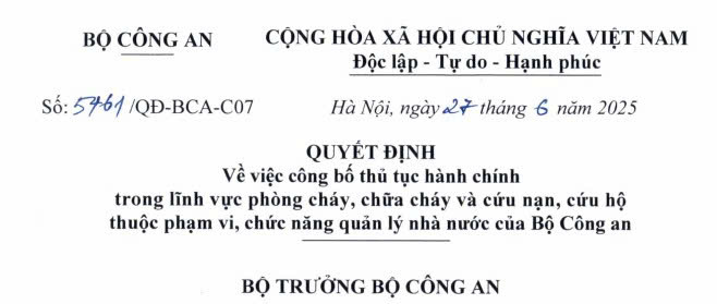 Quyết định số 5461/QĐ-BCA-C07 ngày 27/6/2025 của Bộ trưởng Bộ Công an về việc công bố thủ tục hành chính trong lĩnh vực phòng cháy chữa cháy và cứu nạn, cứu hộ thuộc phạm vi, chức năng quản lý nhà nước của Bộ Công an