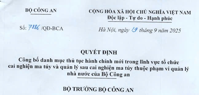 Ngày 19/9/2025, Bộ trưởng Bộ Công an ban hành Quyết định số 7886/QĐ-BCA về việc Công bố danh mục thủ tục hành chính mới trong lĩnh vực tổ chức cai nghiện ma túy và quản lý sau cai nghiện ma túy thuộc phạm vi quản lý nhà nước của Bộ Công an