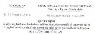 BỘ TRƯỞNG BỘ CÔNG AN CÔNG BỐ THỦ TỤC HÀNH CHÍNH MỚI BAN HÀNH, ĐƯỢC SỬA ĐỔI, BỔ SUNG VÀ BỊ BÃI BỎ TRONG LĨNH VỰC CẤP, QUẢN LÝ CĂN CƯỚC THUỘC THẨM QUYỀN GIẢI QUYẾT CỦA BỘ CÔNG AN