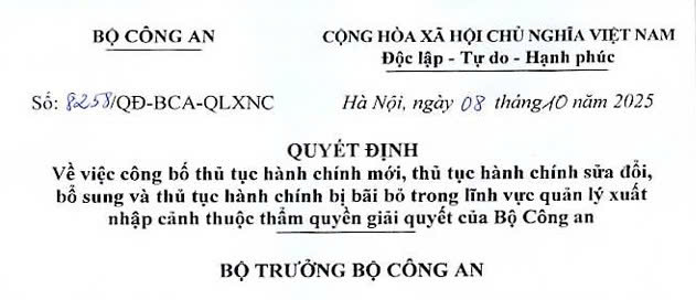Ngày 08/10/2025, Bộ trưởng Bộ Công an ban hành Quyết định số 8258/QĐ-BCA-QLXNC về việc công bố thủ tục hành chính mới, thủ tục hành chính sửa đổi, bổ sung và thủ tục hành chính bị bãi bỏ trong lĩnh vực quản lý xuất nhập cảnh thuộc thẩm quyền giải quyết của Bộ Công an