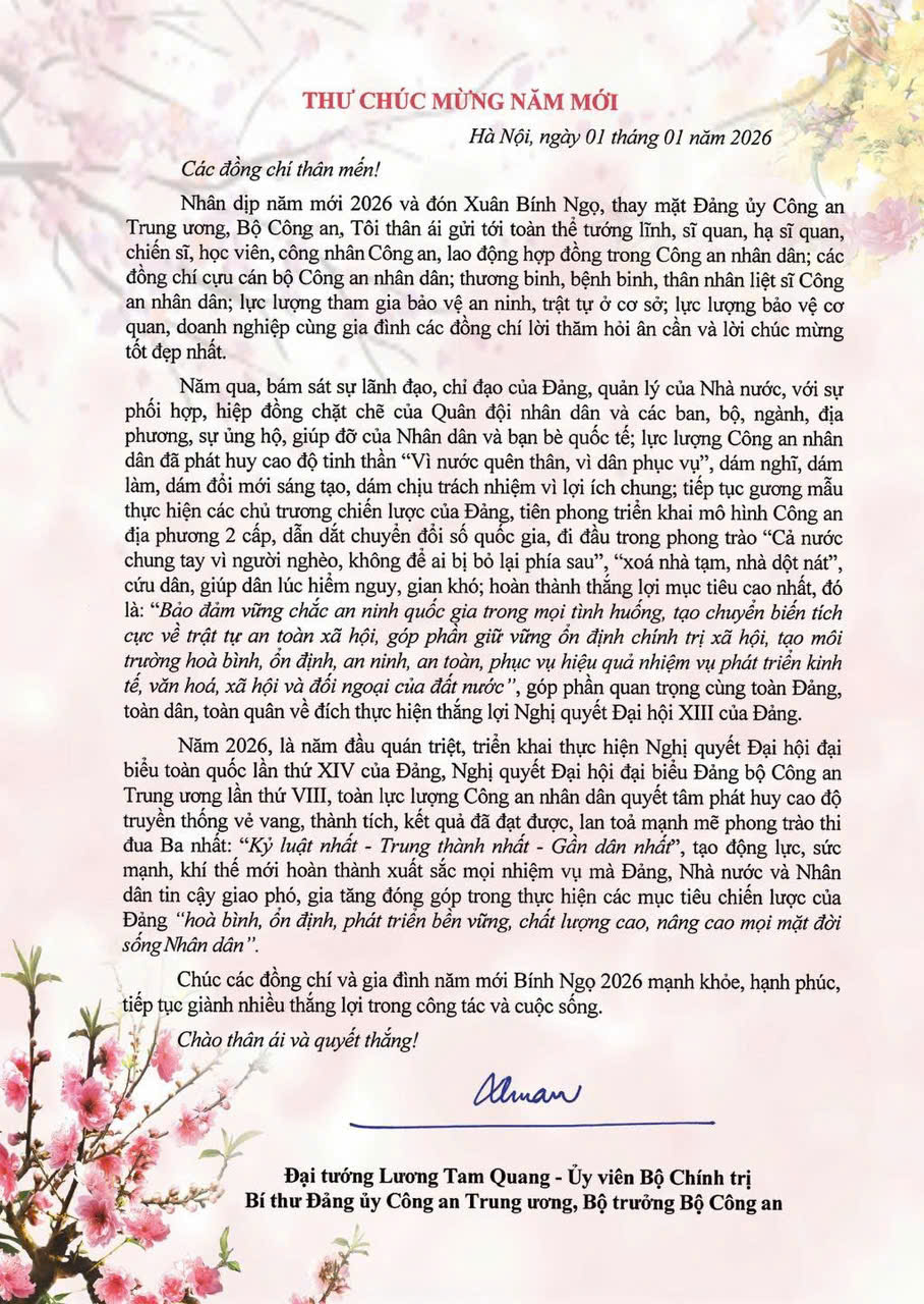 Nhân dịp năm mới 2026 và đón Xuân Bính Ngọ, Đại tướng Lương Tam Quang, Uỷ viên Bộ Chính trị, Bí thư Đảng uỷ Công an Trung ương, Bộ trưởng Bộ Công an có Thư Chúc mừng năm mới gửi tới toàn thể tướng lĩnh, sĩ quan, hạ sĩ quan, chiến sĩ, học viên, công nhân Công an, lao động hợp đồng trong Công an nhân dân; các đồng chí cựu cán bộ Công an nhân dân; thương binh, bệnh binh, thân nhân liệt sĩ Công an nhân dân; lực lượng tham gia bảo vệ an ninh, trật tự ở cơ sở; lực lượng bảo vệ cơ quan, doanh nghiệp cùng gia đình.