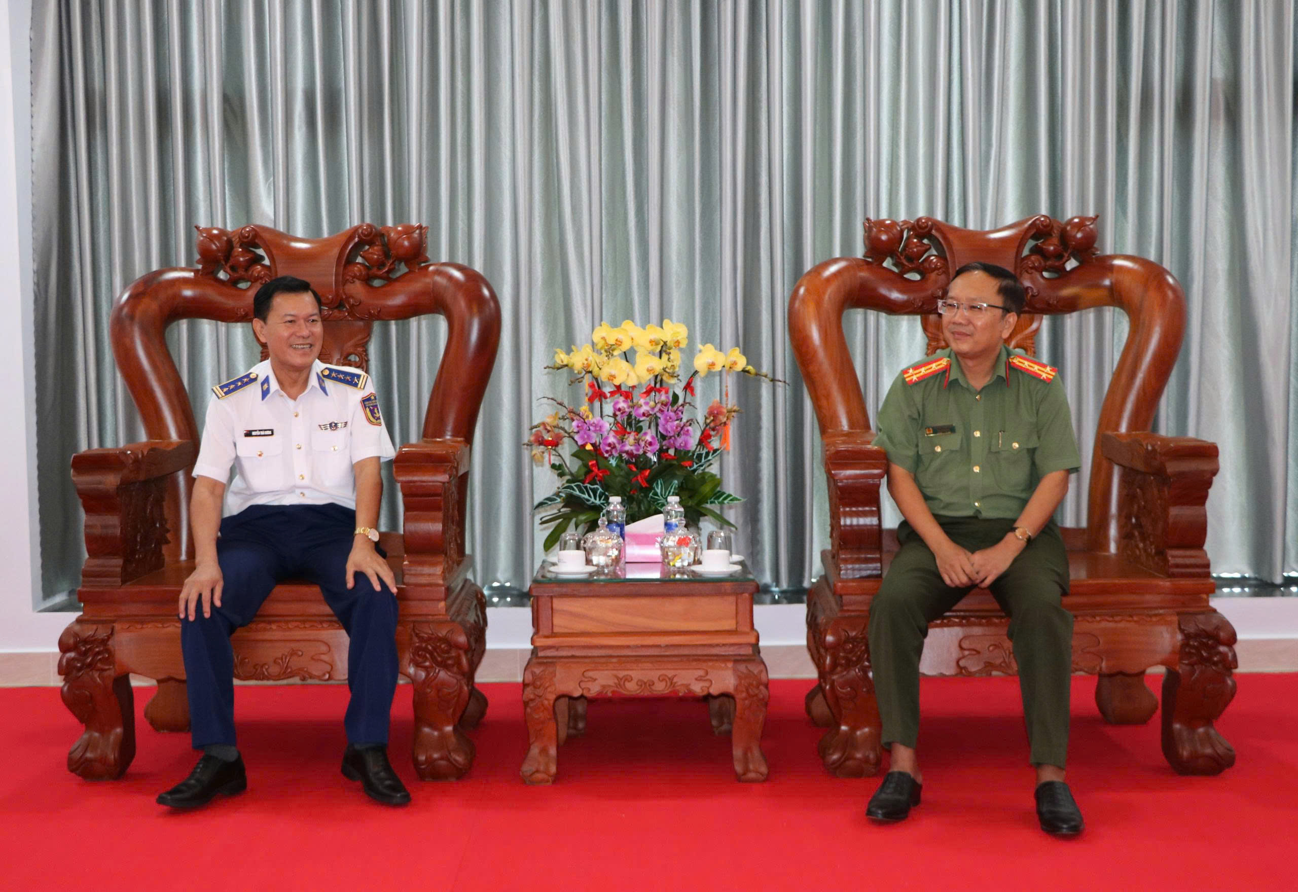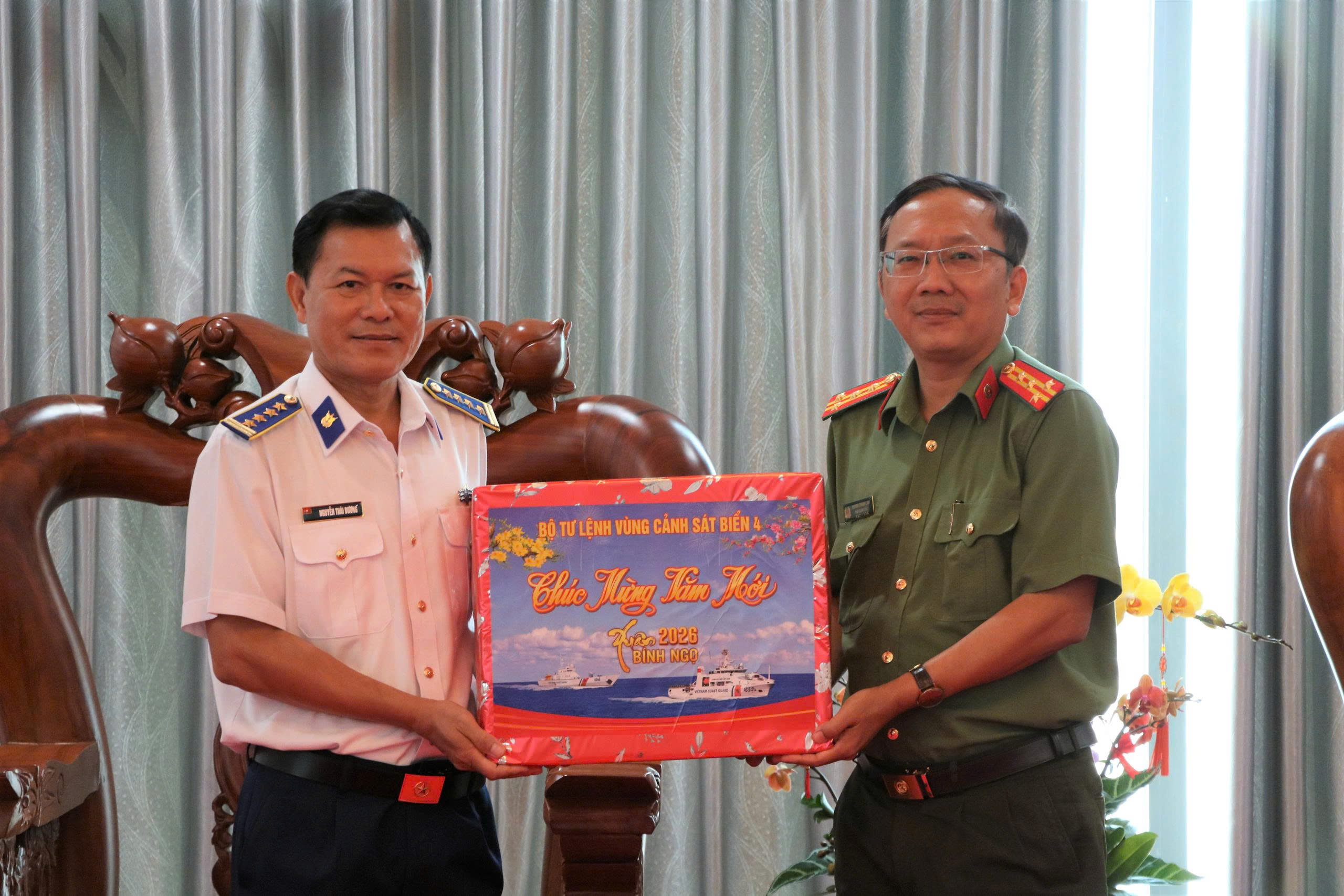 Tại buổi thăm, chúc Tết, lãnh đạo hai đơn vị đã trao đổi nhanh về tình hình an ninh, trật tự trên địa bàn tỉnh An Giang và khu vực biển, đảo trong năm 2025; đánh giá kết quả phối hợp giữa lực lượng Công an tỉnh và Bộ Tư lệnh Vùng Cảnh sát biển 4 trong công tác bảo đảm an ninh, trật tự, đấu tranh phòng, chống tội phạm, nhất là các loại tội phạm liên quan đến buôn lậu, gian lận thương mại, vận chuyển trái phép hàng hóa, ma túy trên tuyến biển và khu vực giáp ranh.