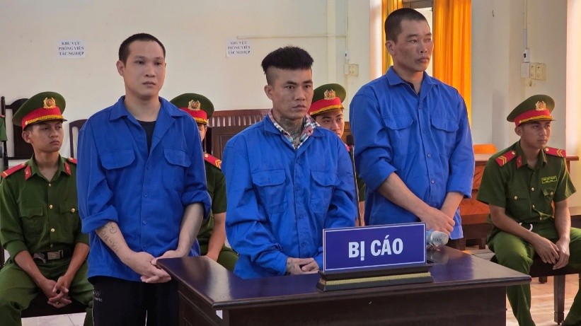 03 bị cáo: Nhiều, Trí và Tài (từ trái sang) tại phiên toà sơ thẩm.