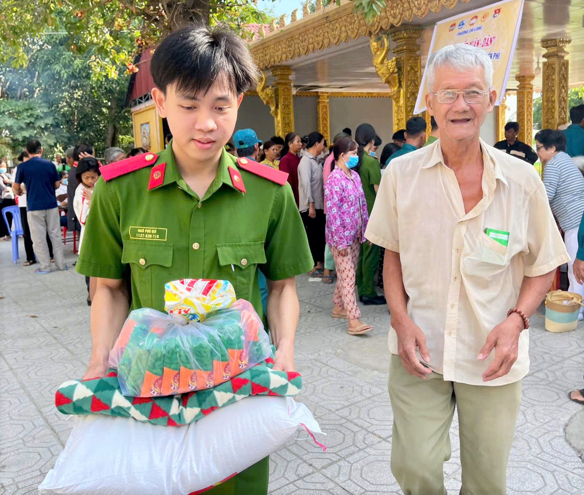 Hình ảnh đoàn viên thanh niên Công an phường hỗ trợ trao quà chongười dân.