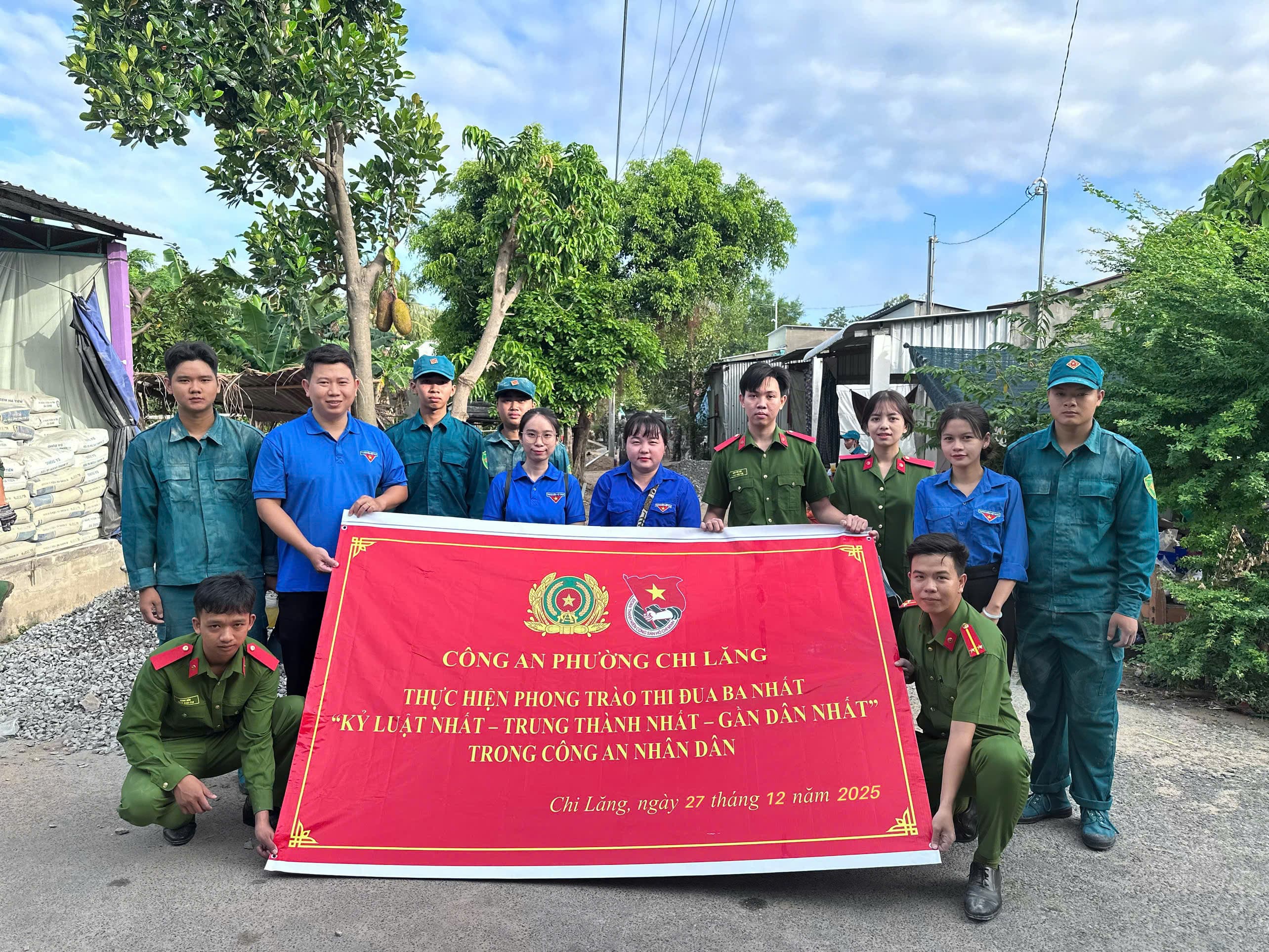 Tích cực hưởng ứng phong trào thi đua “Ba nhất: Kỷ luật nhất - Trung thành nhất - Gần dân nhất” do Bộ Công an và Công an tỉnh An Giang phát động, trong hai ngày 26 và 27/12/2025, Công an phường Chi Lăng phối hợp cùng với Đoàn phường Chi Lăng, Ban chỉ huy Quân sự phường và người dân phường đã tổ chức bê tông hoá các tuyến đường giao thông nông thôn tại Khóm Tân Long, phường Chi Lăng.