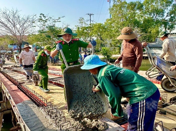 Trước đó vào ngày 03/01/2026, cán bộ, chiến sĩ Công an xã đã phối hợp hỗ trợ người dân vận chuyển vật liệu, đổ bê tông, lắp đặt ván khuôn và thực hiện các phần việc nhằm đẩy nhanh tiến độ thi công. Dù ảnh hưởng thời tiết nắng nóng nhưng các cán bộ, chiến sĩ đều làm việc khẩn trương, thể hiện tinh thần trách nhiệm và sự phối hợp nhịp nhàng của các lực lượng vũ trang và người dân địa phương. Được biết, đây là công trình phục vụ việc đi lại của nhiều hộ dân thuộc ấp Kim Qui B và học sinh Trường THCS&THPT Vân Khánh, tạo thuận lợi cho học sinh đến trường, hỗ trợ lưu thông vận chuyển hàng hóa và tăng cường kết nối giao thương giữa các tuyến đường trong xã.