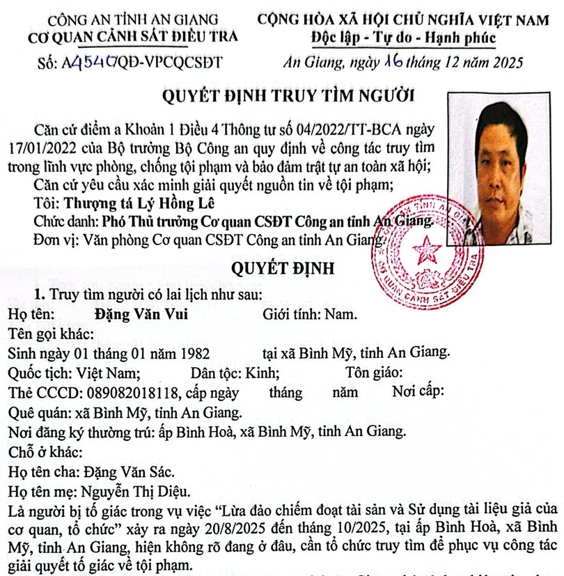 Ngày 17/12, Cơ quan CSĐT Công an tỉnh An Giang cho biết, vừa ra quyết định truy tìm đối tượng Đặng Văn Vui (sinh năm 1982, cư trú ấp Bình Hòa, xã Bình Mỹ, tỉnh An Giang) để phục vụ công tác điều làm rõ thông tin tố giác về hành vi “Lừa đảo chiếm đoạt tài sản” và “Sử dụng tài liệu giả của cơ quan, tổ chức”.