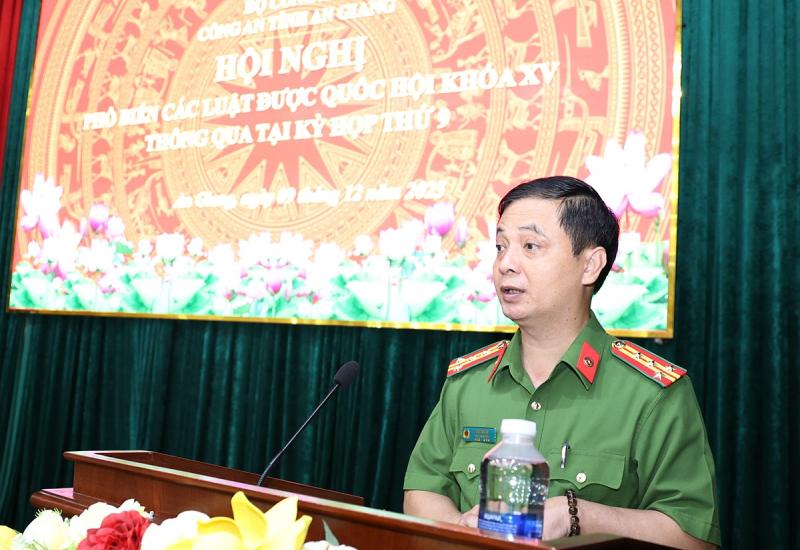 Thượng tá Đinh Xuân Trường - Trưởng Công an đặc khu phát biểu thể hiện sự quyết tâm thực hiện cao điểm tấn công, trấn áp tội phạm.