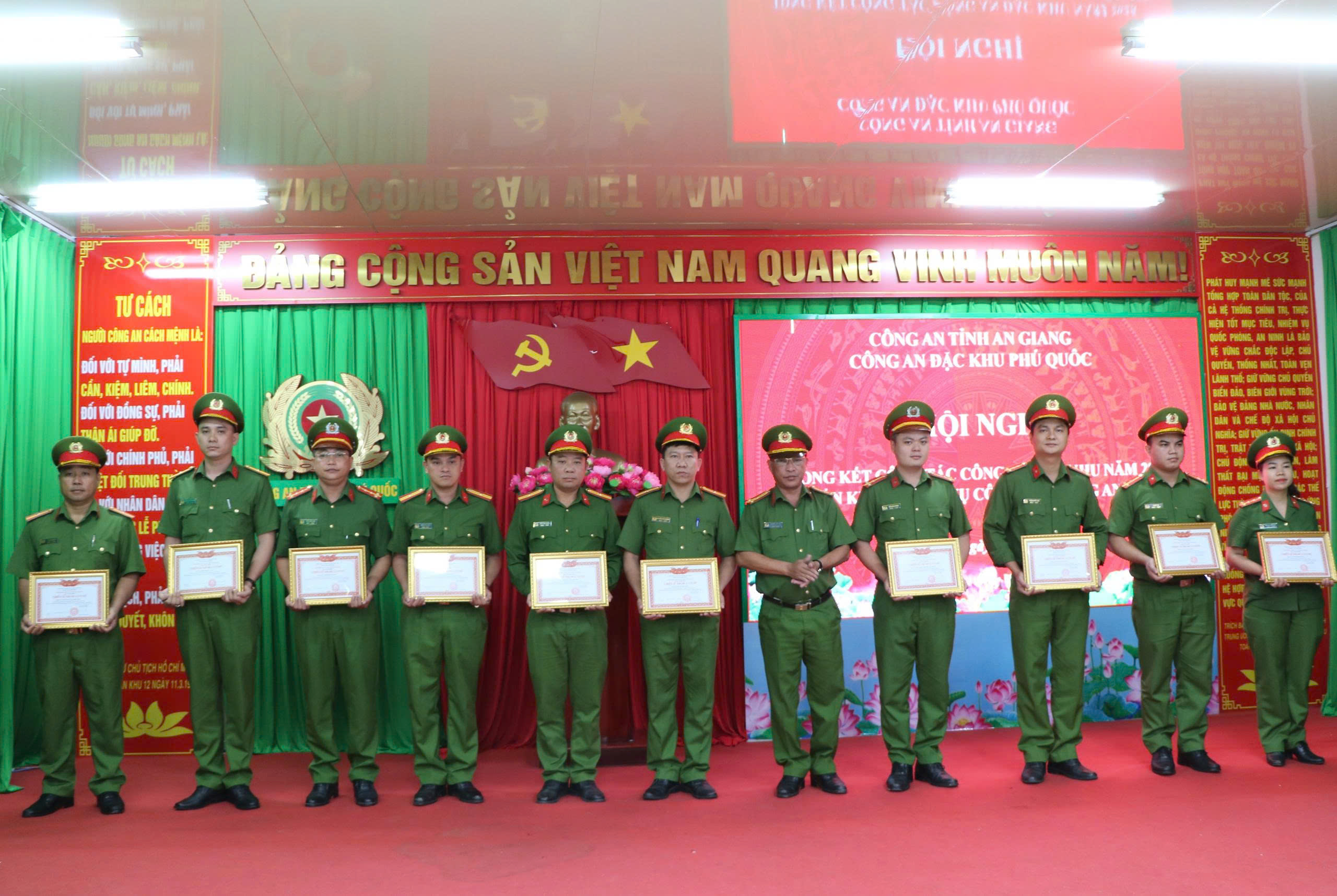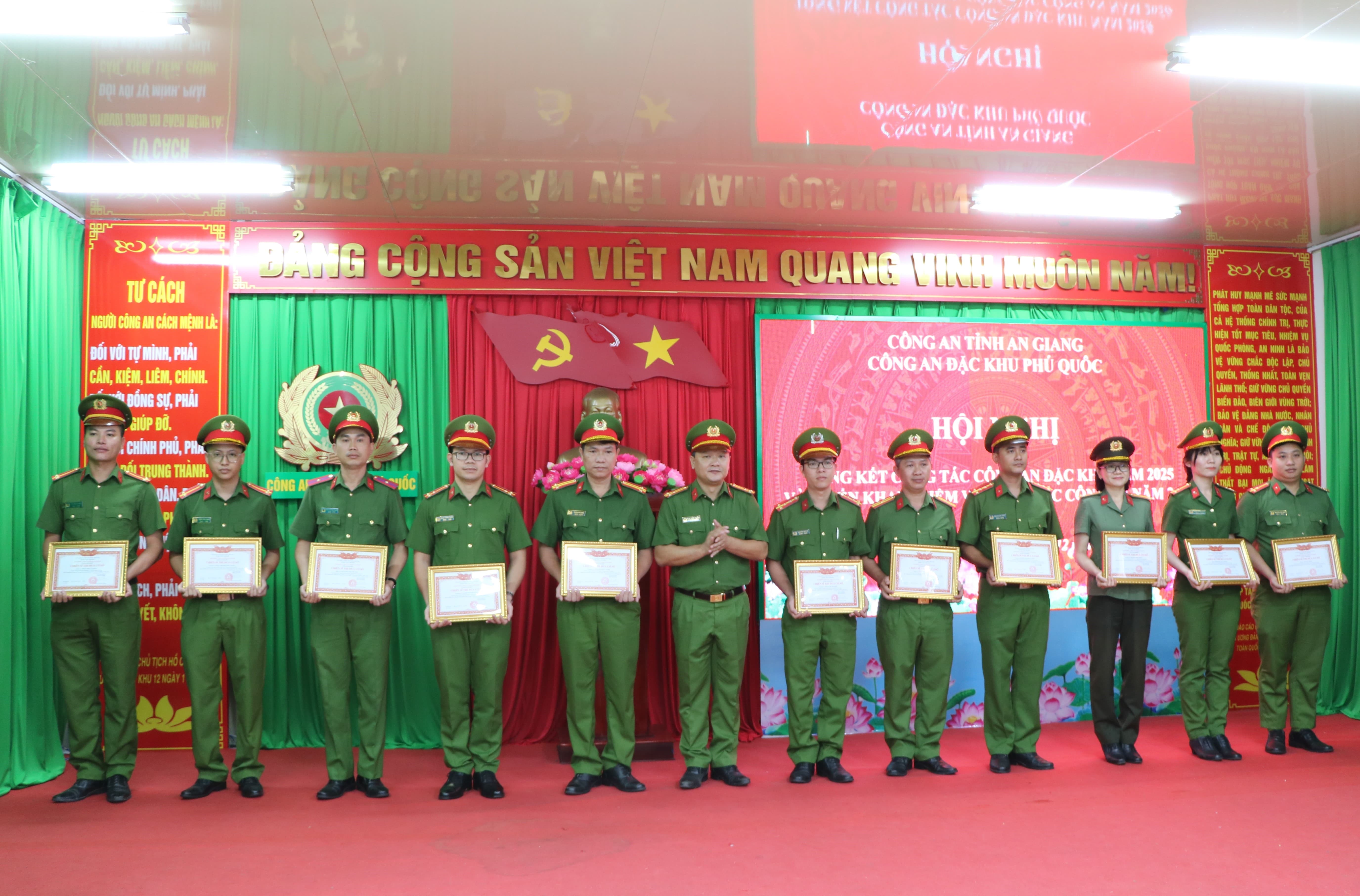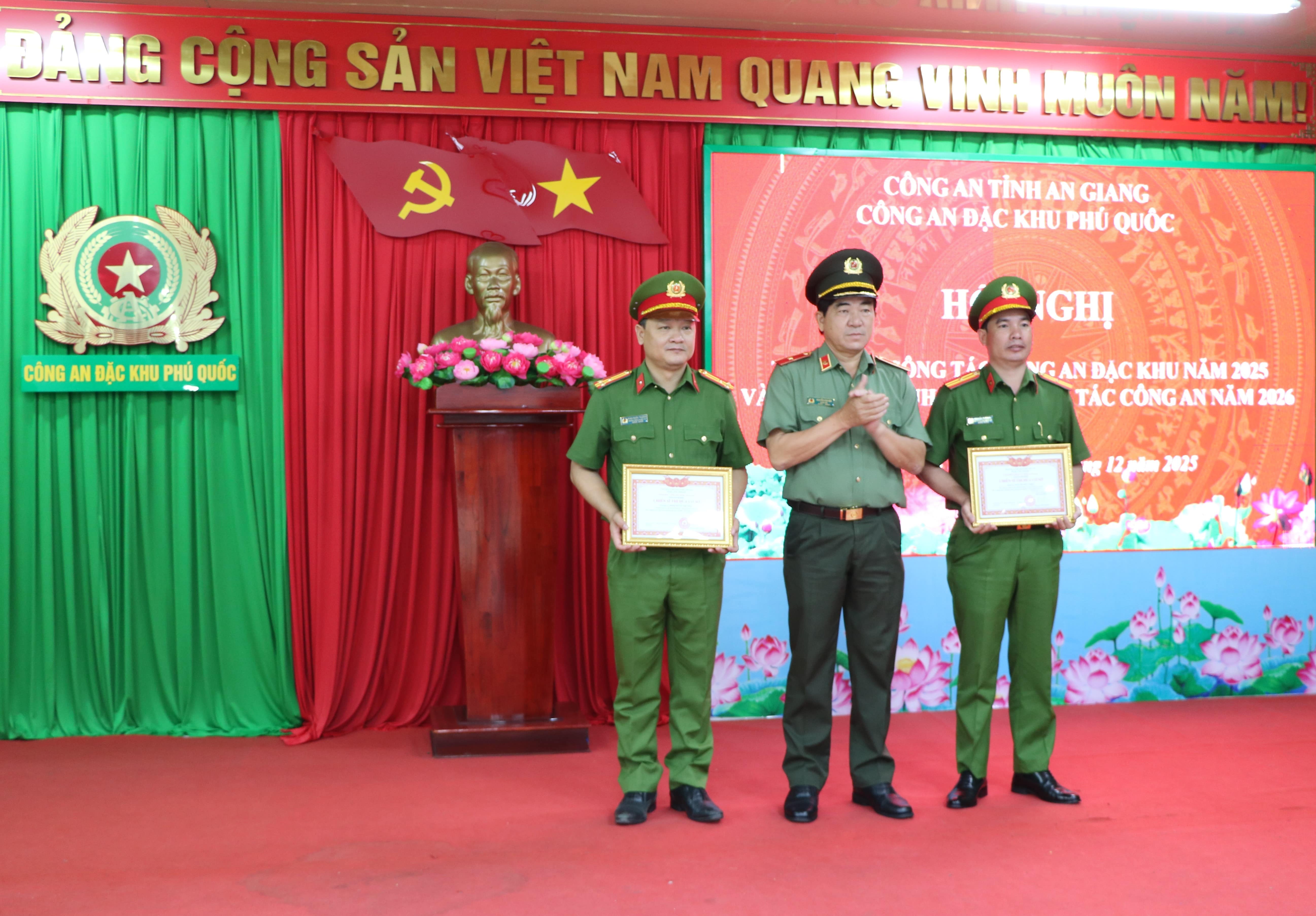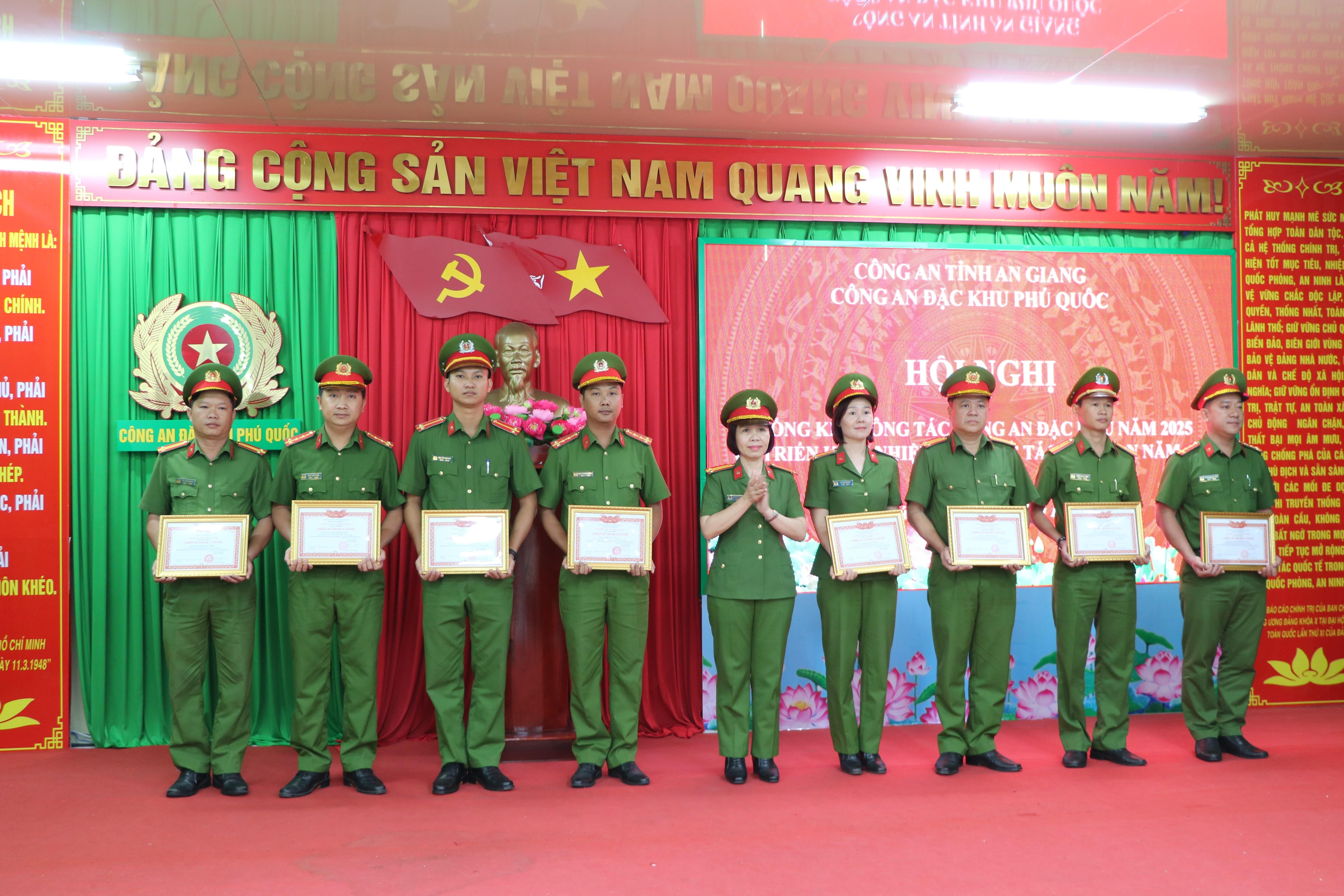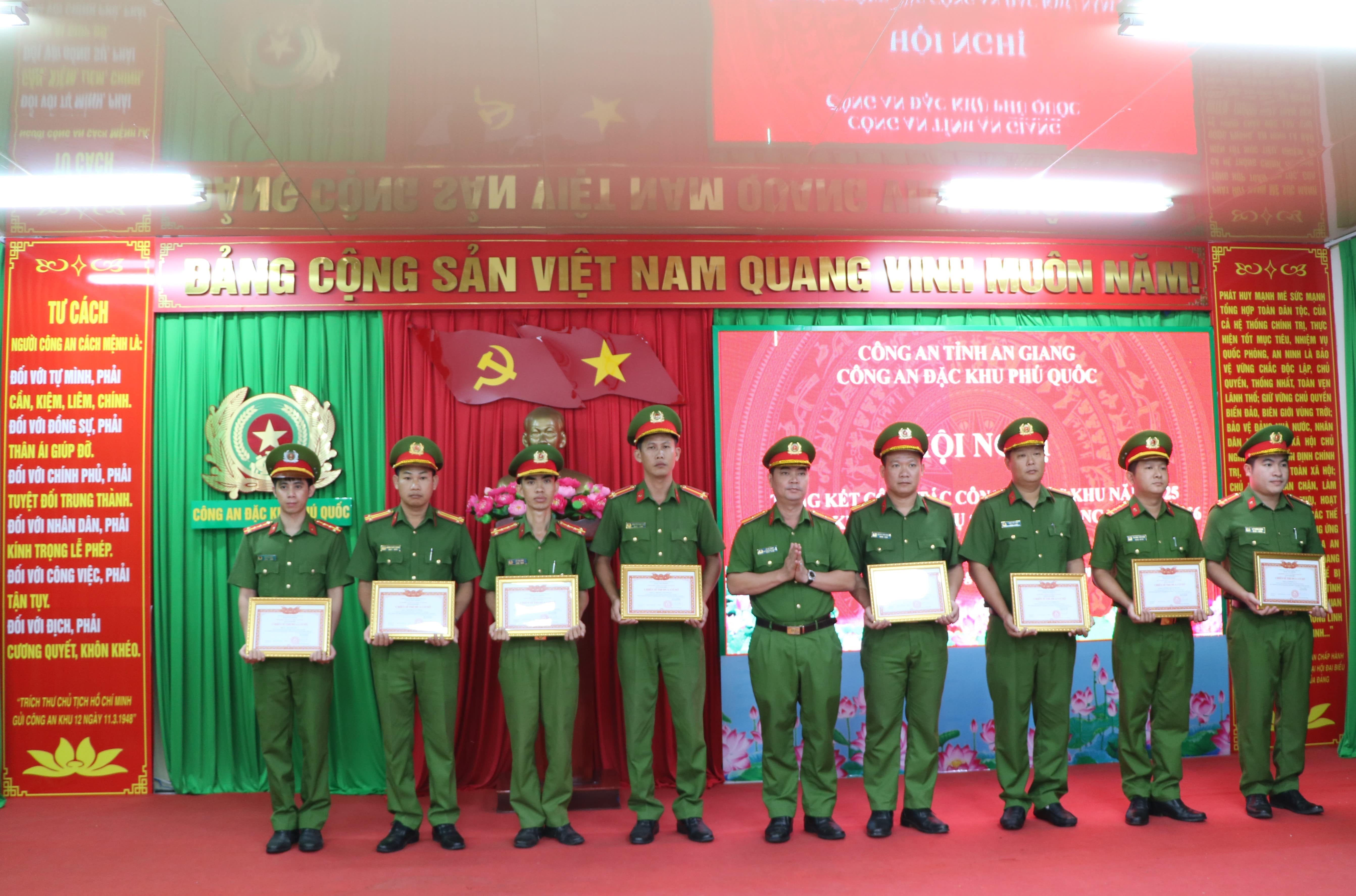 Dịp này, Công an đặc khu Phú Quốc đã phát động phong trào thi đua “Vì an ninh Tổ quốc” năm 2026, tạo khí thế thi đua sôi nổi, cổ vũ cán bộ, chiến sĩ nêu cao tinh thần trách nhiệm, đoàn kết, sáng tạo, hoàn thành tốt mọi nhiệm vụ được giao. Với những thành tích xuất sắc trong năm 2025, Công an đặc khu Phú Quốc vinh dự được công nhận danh hiệu Đơn vị Quyết thắng; đồng chí Thiếu tướng Nguyễn Văn Hận, Giám đốc Công an tỉnh và Ban lãnh đạo Công an đặc khu Phú Quốc đã trao danh hiệu Chiến sĩ thi đua cơ sở cho 64 đồng chí và Chiến sĩ tiên tiến cho 125 đồng chí có thành tích xuất sắc trong phong trào thi đua “Vì an ninh Tổ quốc” năm 2025./.