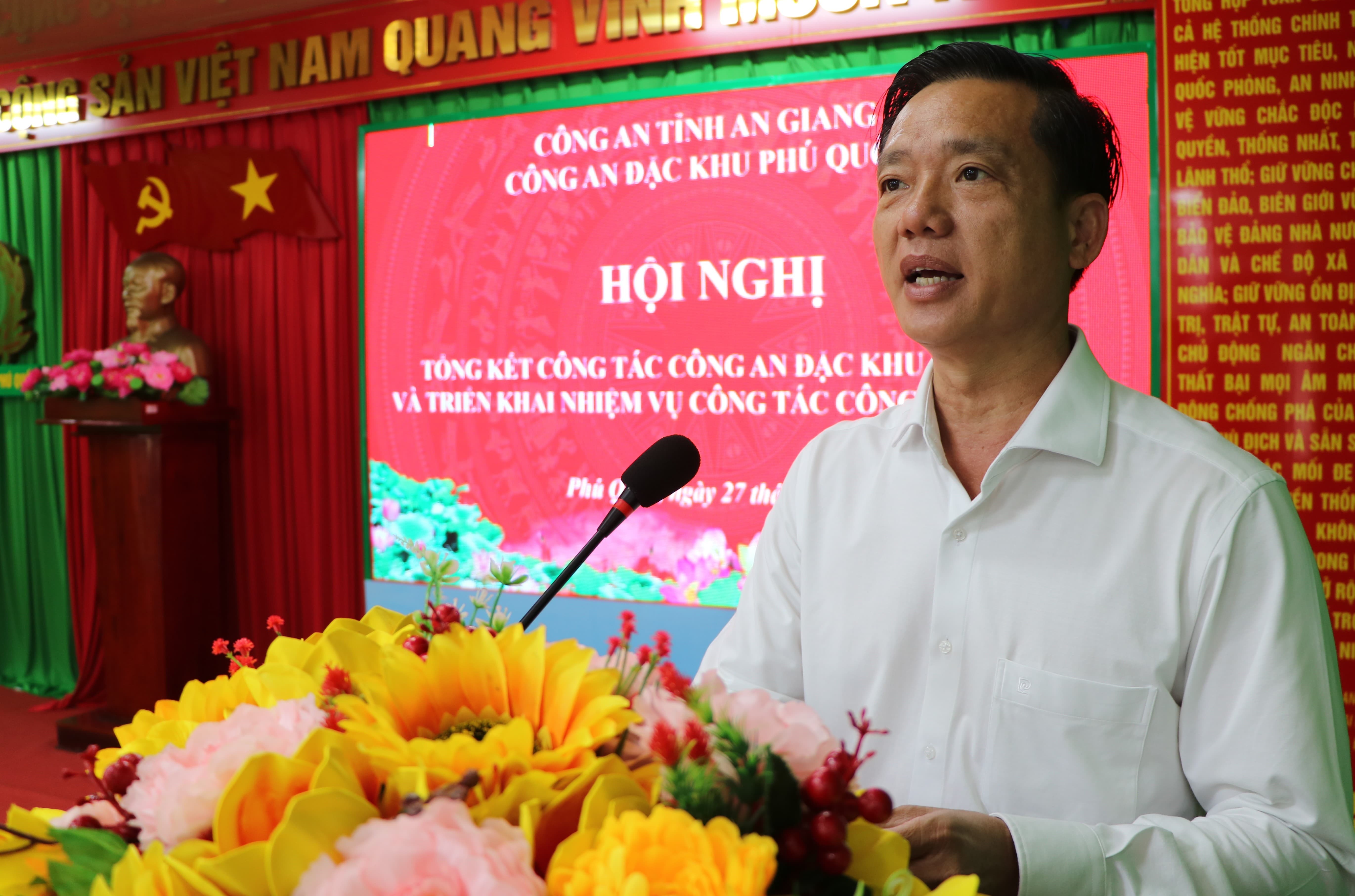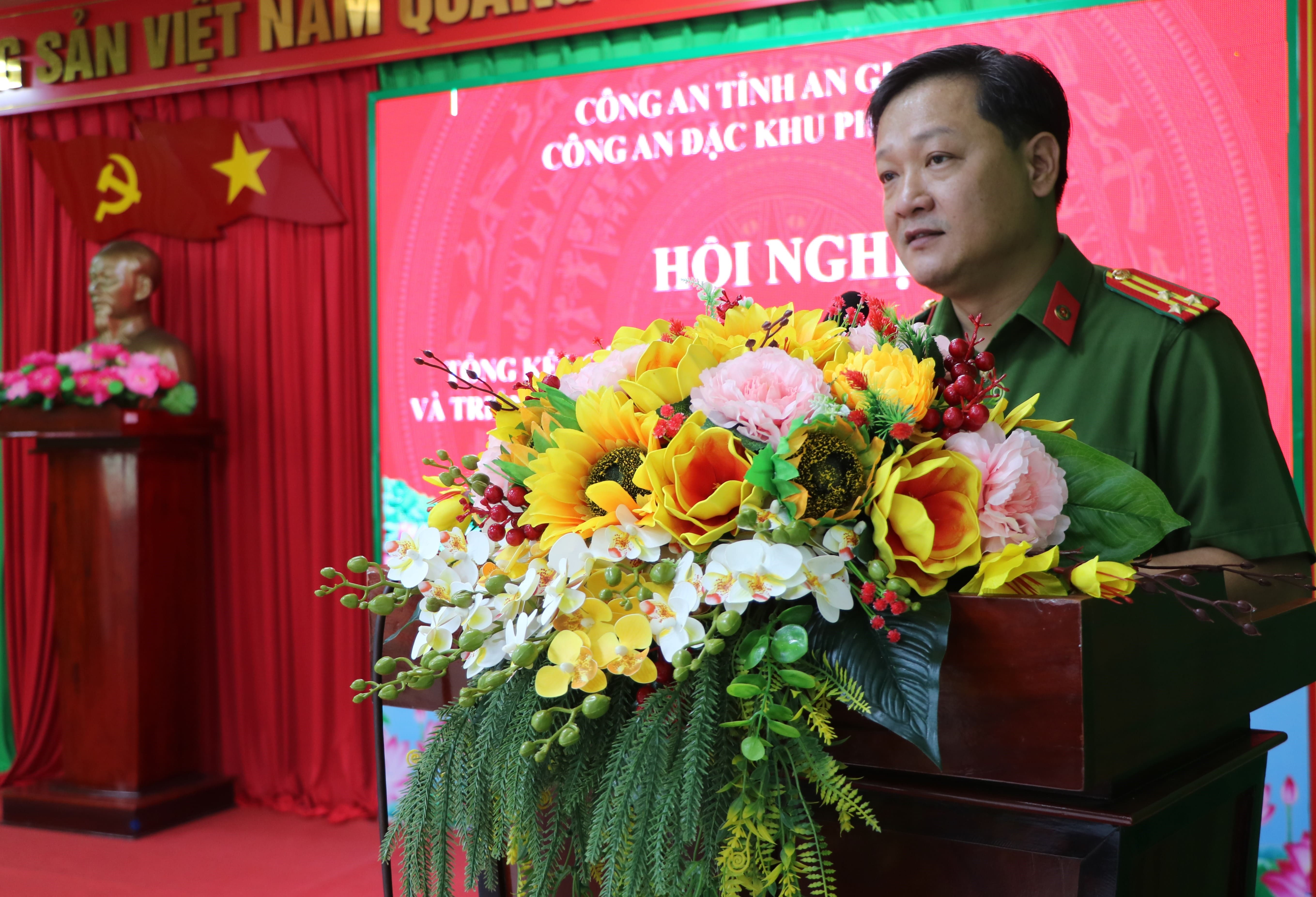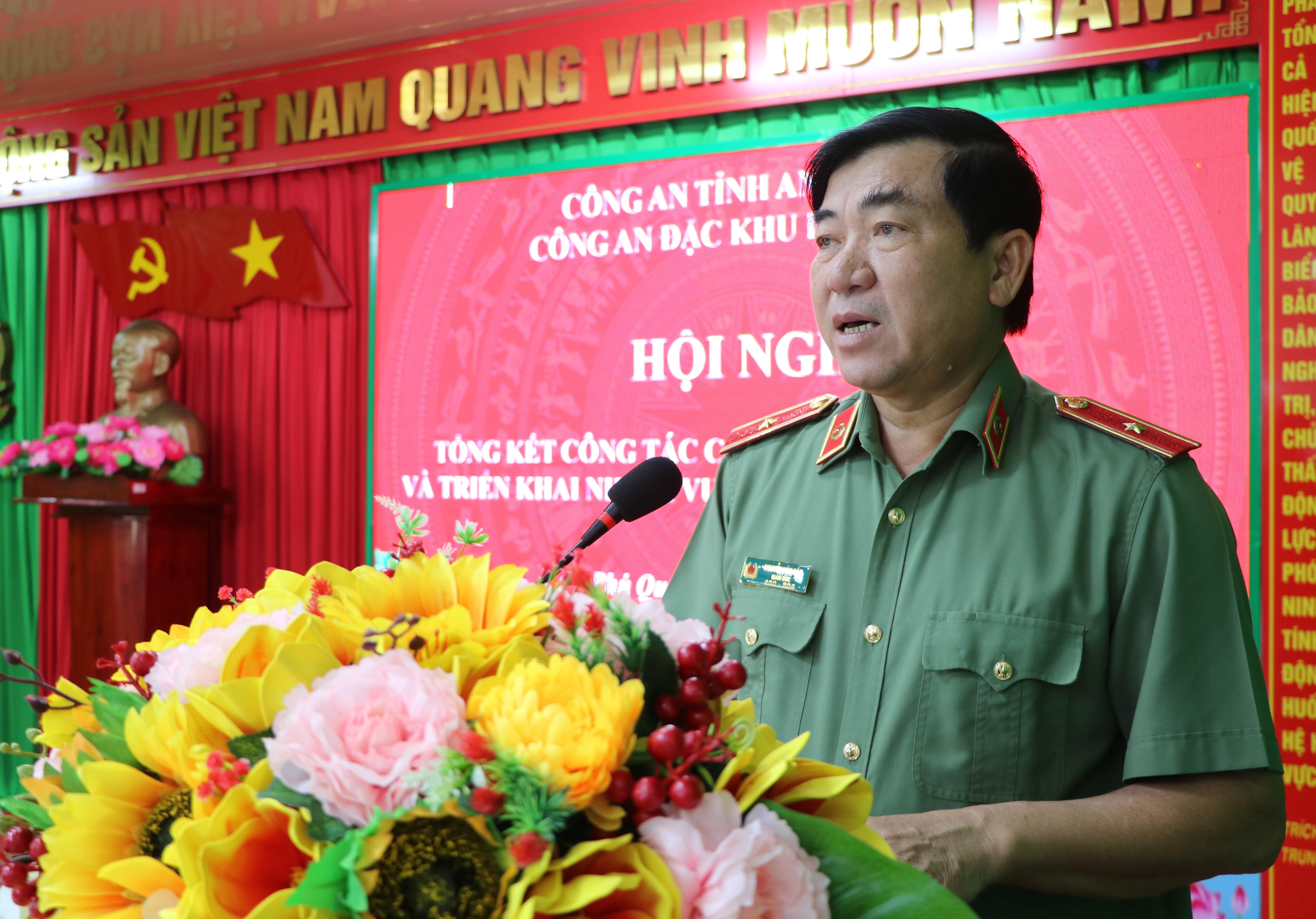 Phát biểu chỉ đạo hội nghị, đồng chí Thiếu tướng Nguyễn Văn Hận, Giám đốc Công an tỉnh ghi nhận, biểu dương những kết quả, thành tích mà Công an đặc khu Phú Quốc đã đạt được trong năm 2025. Đồng chí yêu cầu trong năm 2026, Công an đặc khu tiếp tục bám sát sự lãnh đạo của Tỉnh ủy, UBND tỉnh, Đảng uỷ Ban Giám đốc Công an tỉnh và chính quyền đặc khu; chủ động nắm chắc tình hình từ sớm, từ xa, từ cơ sở; nâng cao chất lượng công tác tham mưu, không để bị động, bất ngờ trong mọi tình huống; tập trung đấu tranh hiệu quả với tội phạm ma túy, tội phạm kinh tế, môi trường, đất đai, khoáng sản và các hành vi vi phạm pháp luật liên quan đến người nước ngoài; đồng thời chú trọng xây dựng lực lượng Công an đặc khu thật sự trong sạch, vững mạnh, đáp ứng yêu cầu nhiệm vụ trong tình hình mới.
