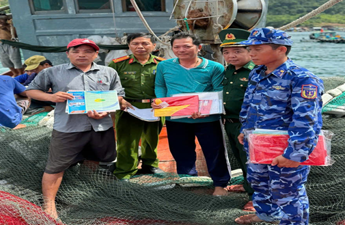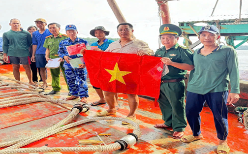 Lực lượng Công an đặc khu Thổ Châu, Bộ đội Biên phòng Thổ Châu và Cảnh sát biển 4 phối hợp tuyên truyền chống khai thác IUU và trao tặng cờ Tổ quốc cho ngư dân.