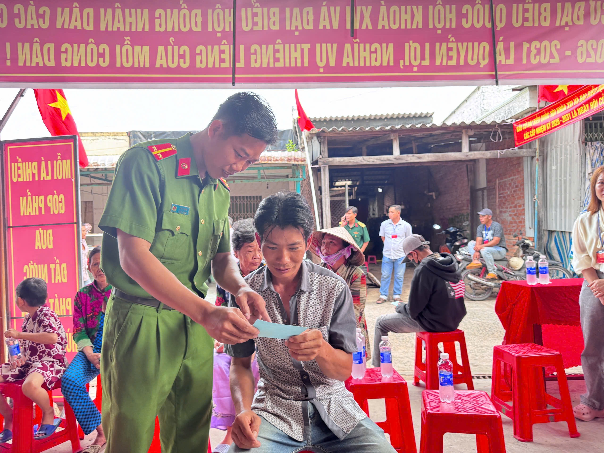 Là một trong những lực lượng nồng cốt trong giữ gìn an ninh, trật tự, cán bộ, chiến sĩ Công an xã đã thể hiện tinh thần trách nhiệm cao trong công tác tuần tra, canh gác, bảo vệ tình hình an ninh trật tự tại các khu vực bỏ phiếu. Đồng thời, tận tình hướng dẫn cử tri thực hiện các bước bỏ phiếu đúng quy định, bảo đảm mỗi lá phiếu được thực hiện thuận lợi, an toàn và đúng pháp luật.