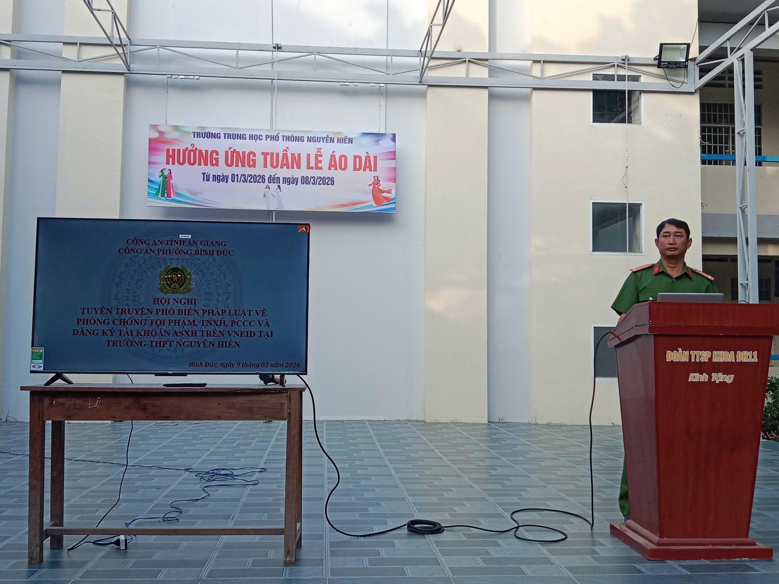 Ngày 09/3, Công an phường Bình Đức tổ chức buổi tuyên truyền về phòng, chống tội phạm, tệ nạn xã hội, công tác phòng cháy, chữa cháy và hướng dẫn đăng ký, sử dụng tài khoản An sinh xã hội cho 1.540 cán bộ, giáo viên và học sinh Trường THPT Nguyễn Hiền.