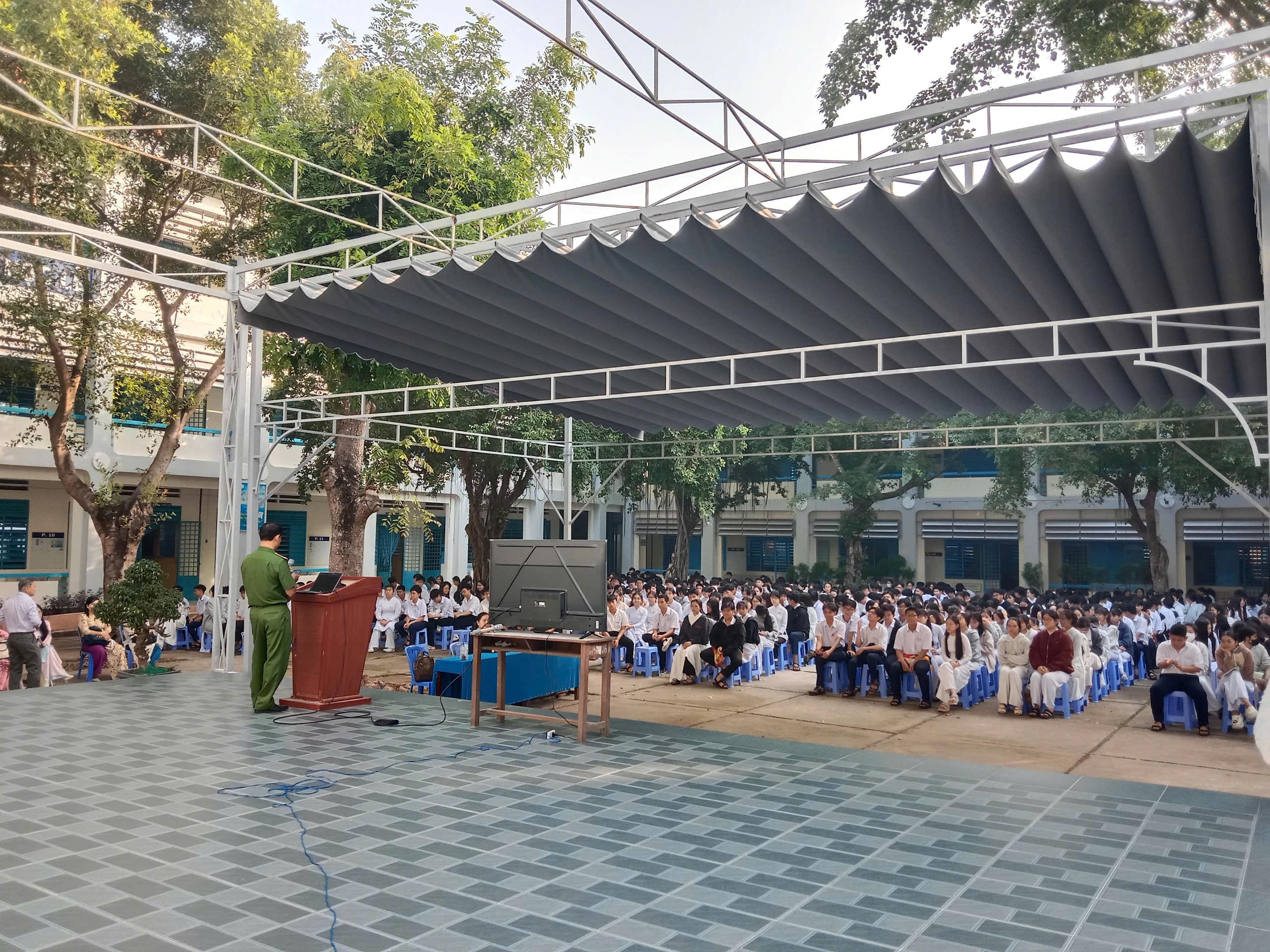 Công an phường Bình Đức tuyên truyền phòng, chống tội phạm, tệ nạn xã hội, phòng cháy, chữa cháy và tài khoản An sinh xã hội tại Trường THPT Nguyễn Hiền