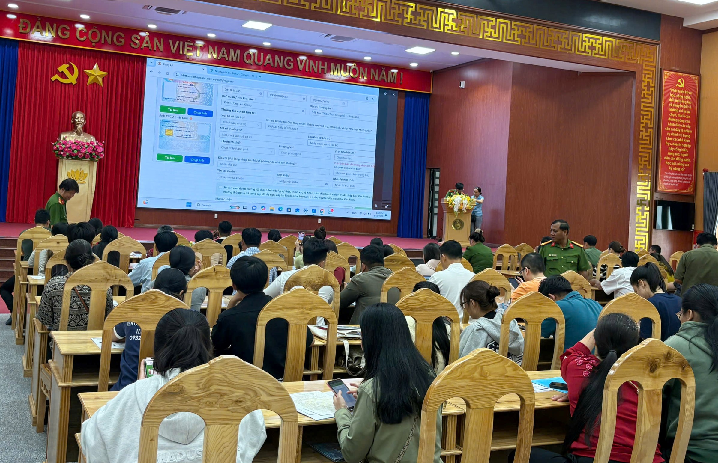 Qua Hội nghị Cán bộ Phòng Quản lý xuất nhập cảnh và Công an phường Hà Tiên trực tiếp hướng dẫn 145 chủ cơ sở lưu trú cách đăng ký và sử dụng tài khoản khai báo tạm trú trên phần mềm internet; Quy trình cập nhật thông tin khách nước ngoài nhanh chóng và công dân Việt Nam lưu trú chính xác; Giải đáp các vướng mắc phát sinh trong quá trình vận hành hệ thống thực tế tại cơ sở.