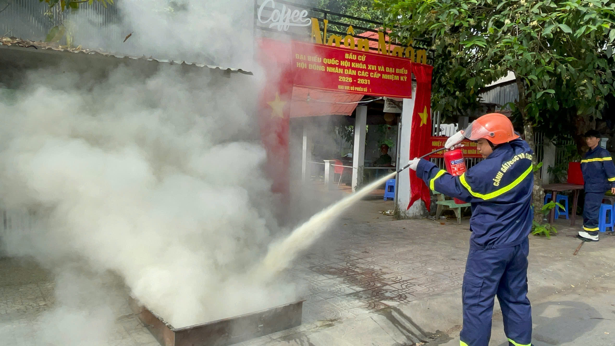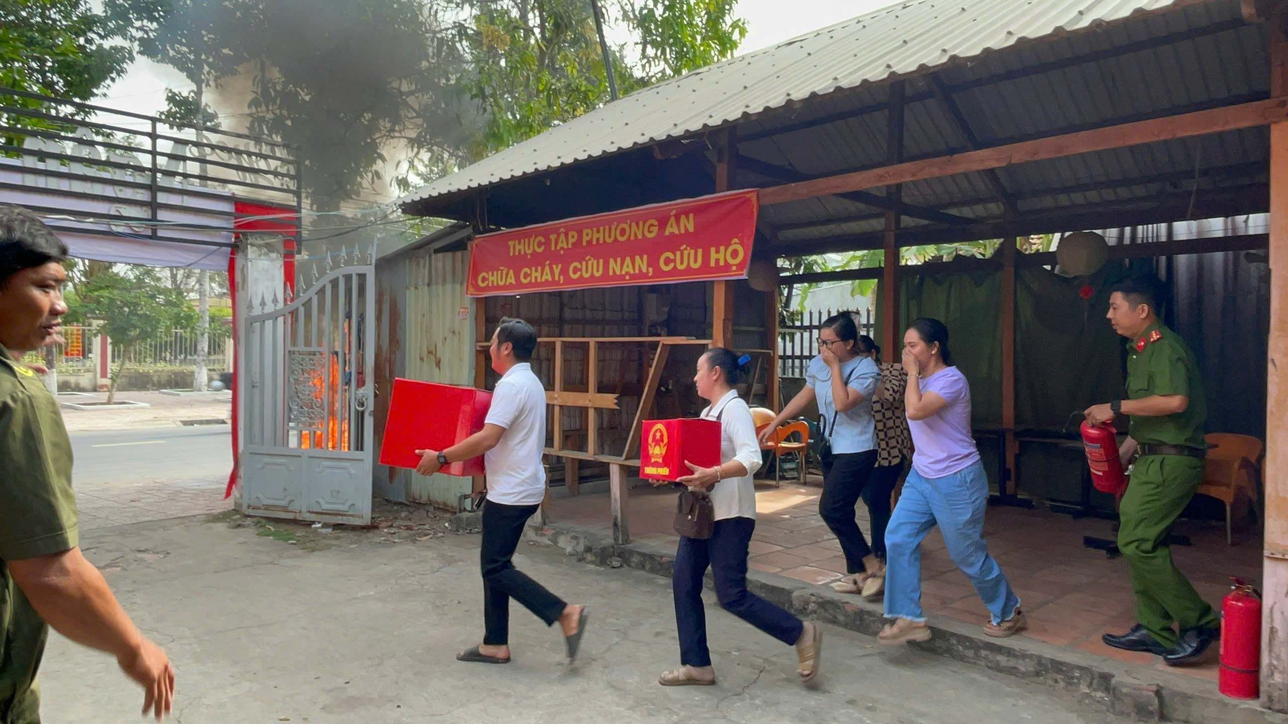 Tình huống giả định, tại khu vực bỏ phiếu số 1 xảy ra sự cố chập điện dẫn đến phát sinh đám cháy. Do khu vực này tập trung nhiều vật liệu dễ cháy như bàn, ghế, hồ sơ, tài liệu nên đám cháy nhanh chóng bùng phát mạnh, bao trùm toàn bộ khu vực tổ chức bỏ phiếu, tiềm ẩn nguy cơ đe dọa đến tính mạng của cán bộ làm nhiệm vụ và cử tri đang thực hiện quyền và nghĩa vụ công dân.