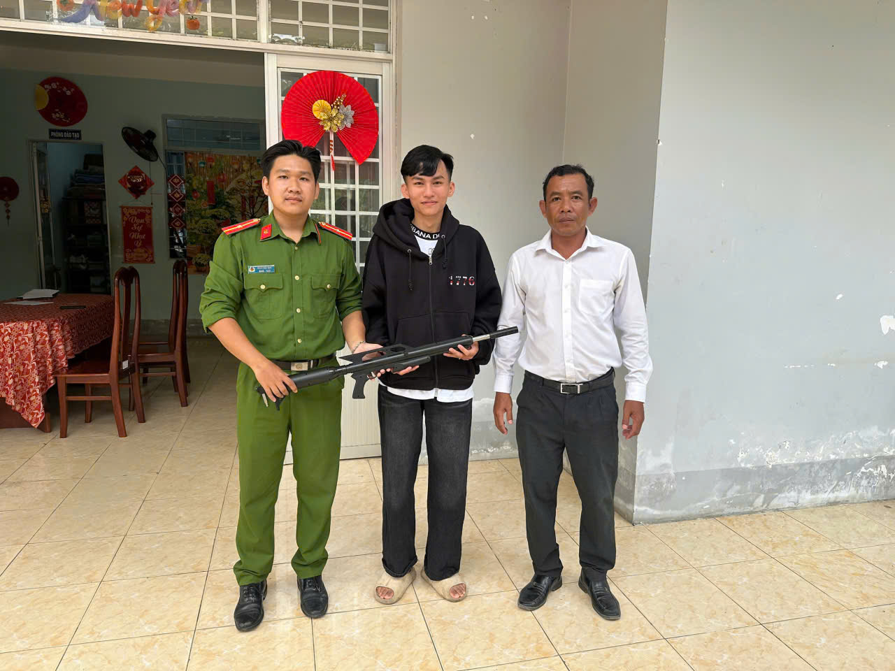 Cụ thể, vào ngày 27/02/2026, em V.P.M.Đ là học sinh Trường Trung cấp Kỹ thuật Tổng hợp An Giang (Cơ sở 3) đã đến Công an phường Long Phú tự nguyện giao nộp 01 khẩu súng hơi tự chế. Theo trình bày, khẩu súng trên do em nhặt được tại tuyến Quốc lộ N1 thuộc địa bàn phường Long Phú. Công an phường đã tiến hành lập biên bản tiếp nhận, thu giữ và xử lý theo đúng quy định của pháp luật.