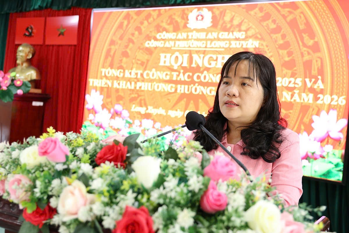 Phát biểu chỉ đạo tại Hội nghị, Chủ tịch UBND phường Long Xuyên Đoàn Thị Hương Hà ghi nhân và biểu dương những nỗ lực và kết quả đạt được của Công an phường Long Xuyên trong năm 2025; Đồng thời, đồng chí Chủ tịch UBND phường đề nghị Công an phường tiếp tục thực hiện tốt vai trò tham mưu với Đảng ủy, UBND phường chỉ đạo và phối hợp chặt chẽ với các ban, ngành, đoàn thể phát huy sức mạnh tổng hợp của cả hệ thống chính trị, tranh thủ sự ủng hộ, giúp đỡ của các tầng lớp nhân dân để thực hiện thắng lợi mục tiêu, yêu cầu đề ra đối với công tác bảo đảm an ninh, trật tự trên địa bàn phường; lực lượng Công an phường phải nắm chắc, đánh giá, dự báo sát, đúng tình hình, chủ động tham mưu, đề xuất với Đảng ủy, UBND phường các chủ trương, giải pháp bảo vệ an ninh quốc gia, bảo đảm trật tự, an toàn xã hội. Trong đó cần tập trung quán triệt và triển khai thực hiện quyết liệt, hiệu quả các chỉ đạo của Ban Giám đốc Công an tỉnh và Đảng ủy, UBND phường trong các đợt cao điểm tấn công, trấn áp tội phạm đảm bảo an ninh trật tự; tiếp tục triển khai thực hiện kế hoạch xây dựng “phường không ma túy” giai đoạn 2025 – 2030. Bên cạnh đó, Ban Chỉ huy Công an phường phải làm tốt công tác giáo dục chính trị tư tưởng cho cán bộ, chiến sỹ; triển khai thực hiện hiệu quả phong trào thi đua “Ba nhất: Kỷ luật nhất – Trung thành nhất – Gần dân nhất” giai đoạn 2025 – 2030.