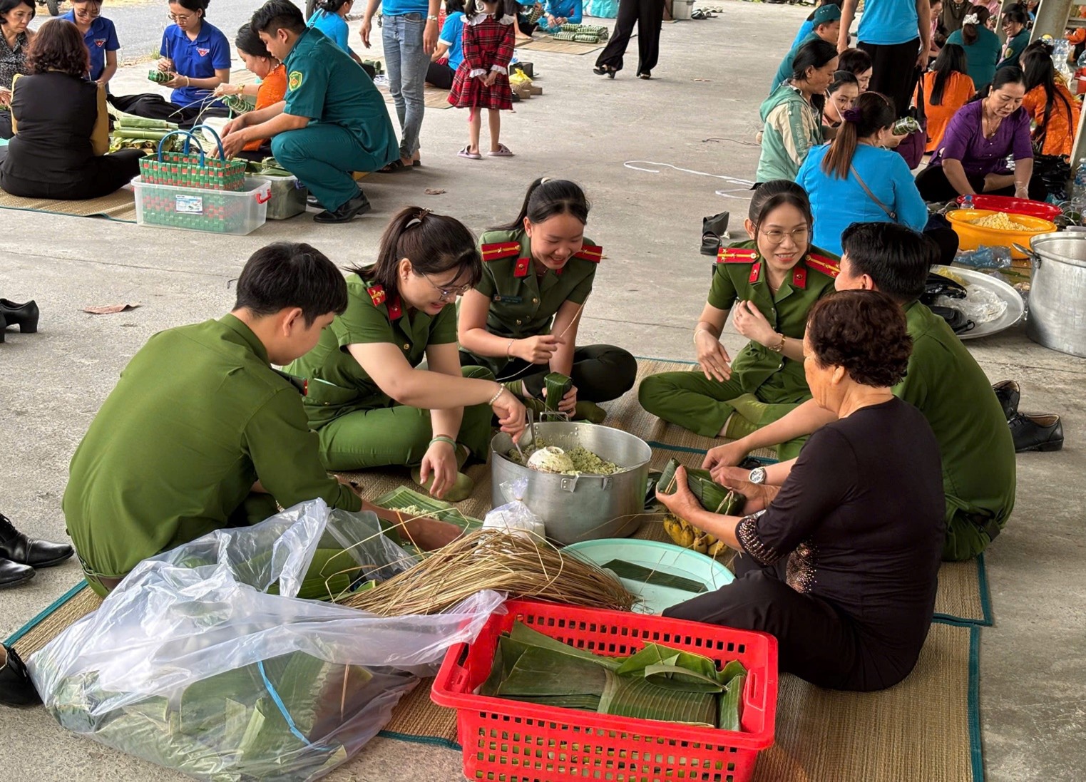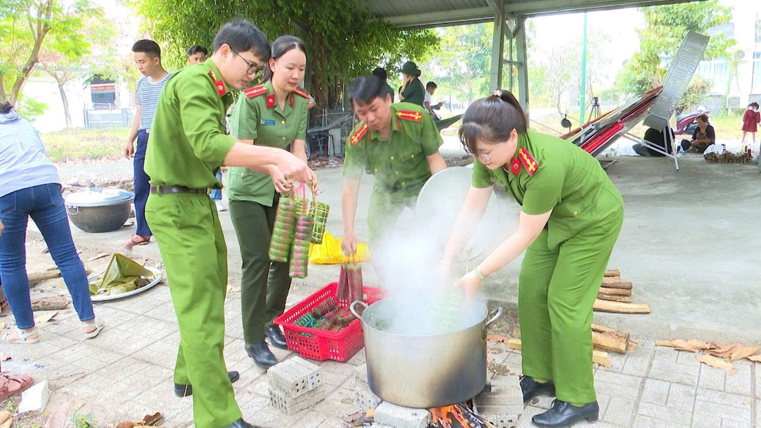 Chi Đoàn Thanh niên và Chi Hội phụ nữ Công an phường tham gia Ngày hội gói, nấu bánh tét