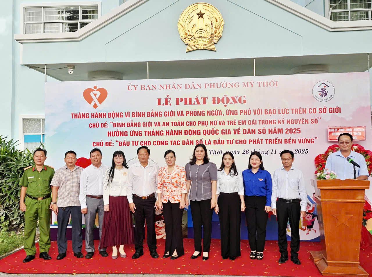 Ngày 26/11/2025, Uỷ ban nhân dân phường Mỹ Thới tổ chức lễ phát động Tháng hành động vì bình đẳng giới và phòng ngừa, ứng phó với bạo lực trên cơ sở giới năm 2025 và hưởng ứng Tháng hành động Quốc gia về dân số năm 2025. Tham dự buổi Lễ có bà Vương Mai Trinh, Phó Bí thư Đảng uỷ, Chủ tịch UBND phường; ông Dương Anh Dũng, Phó Chủ tịch UBND phường, cùng đại diện các ban ngành, đoàn thể và hơn 20 đồng chí là Chỉ huy, cán bộ, chiến sĩ Công an phường Mỹ Thới.