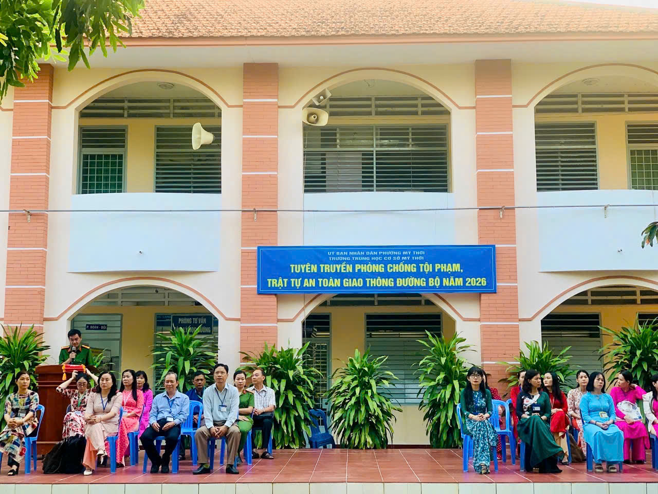 Nhằm tăng cường công tác tuyên truyền, phổ biến, giáo dục pháp luật cho học sinh, góp phần nâng cao ý thức chấp hành pháp luật và xây dựng môi trường học đường an toàn, lành mạnh, ngày 09/3/2026, Công an phường Mỹ Thới phối hợp với Ban Giám hiệu Trường THCS Mỹ Thới tổ chức buổi tuyên truyền pháp luật về trật tự an toàn giao thông đường bộ và phòng, chống bạo lực học đường cho gần 1.500 em học sinh của nhà trường.