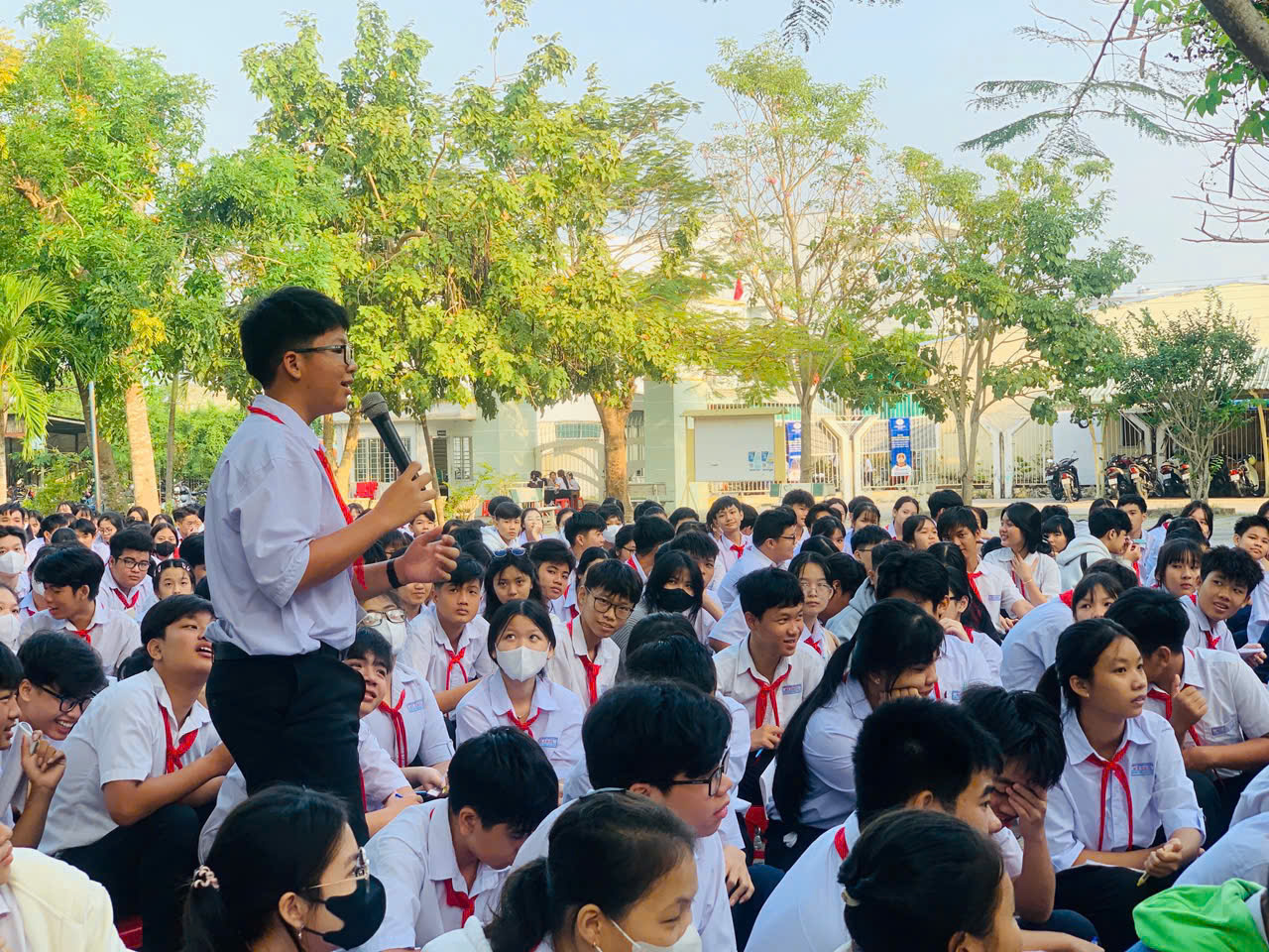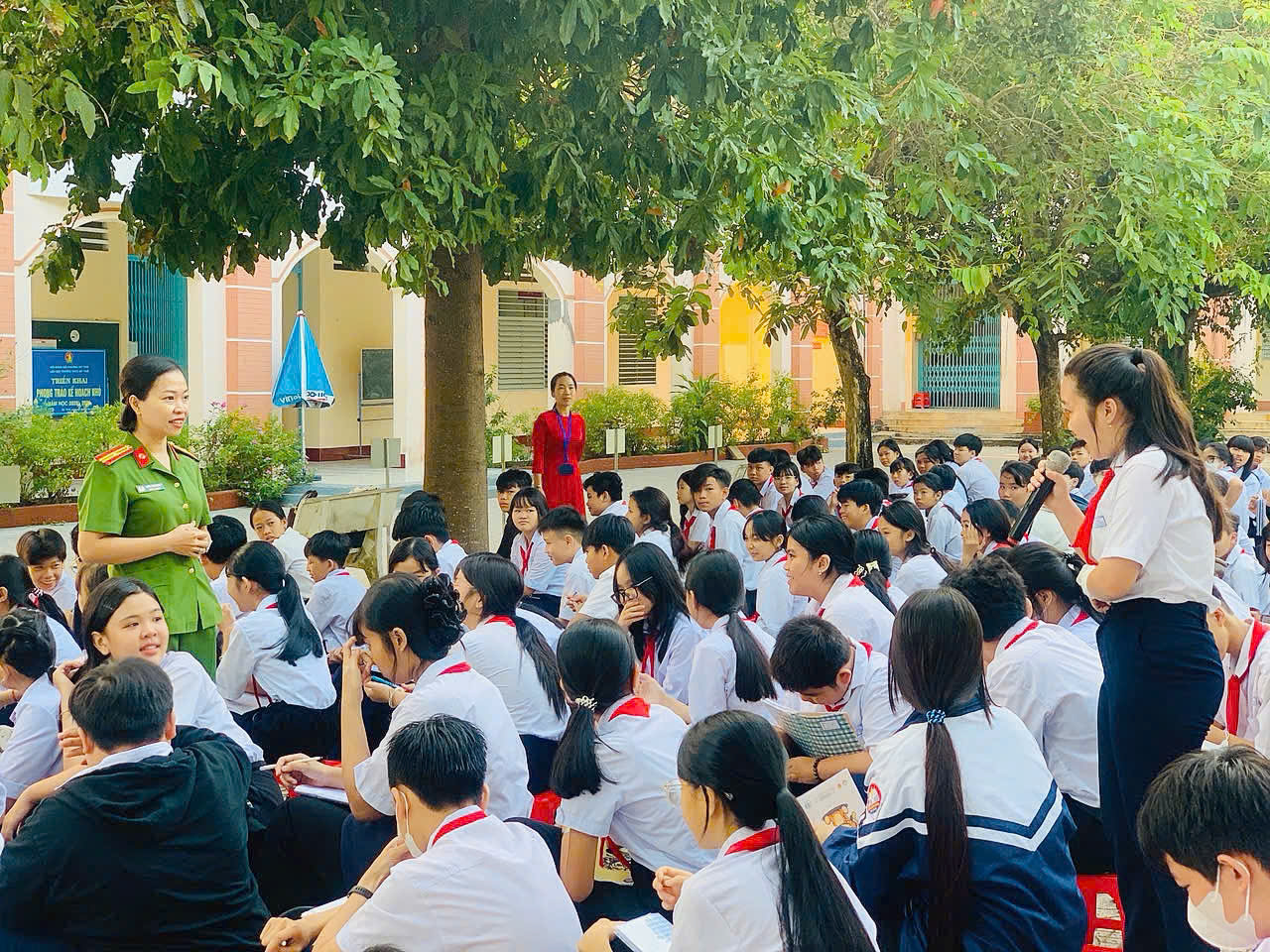 Trong buổi tuyên truyền, các em học sinh chăm chú lắng nghe, tích cực tham gia trao đổi và trả lời các câu hỏi liên quan đến nội dung được phổ biến. Không khí buổi tuyên truyền diễn ra sôi nổi, tạo sự tương tác tích cực giữa cán bộ tuyên truyền và học sinh, giúp các em tiếp thu kiến thức pháp luật một cách dễ hiểu, thiết thực và hiệu quả.