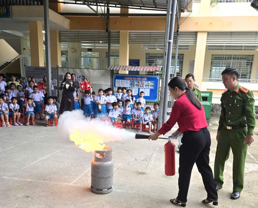 ‎Tại buổi tuyên truyền, cán bộ Công an phường đã truyền đạt những nội dung cơ bản của pháp luật về trật tự, an toàn giao thông đường bộ; kỹ năng phòng ngừa về tai nạn giao thông. Đồng thời, lực lượng Công an phường giới thiệu các nguyên nhân phổ biến, cách nhận biết nguy cơ dẫn đến cháy, nổ; trang bị kỹ năng xử lý các tình huống khi có cháy, nổ xảy ra và biện pháp thoát hiểm an toàn; cách sử dụng bình cứu hỏa và sử dụng bình chữa cháy xách tay dập tắt đám cháy qua tình huống giả định. Qua đó, giúp cán bộ, giáo viên và học sinh nâng cao nhận thức, chấp hành nghiêm chỉnh pháp luật về trật tự, an toàn giao thông, đồng thời, chủ động phòng ngừa, ứng phó các nguy cơ cháy, nổ trong Nhà trường và đời sống hàng ngày.