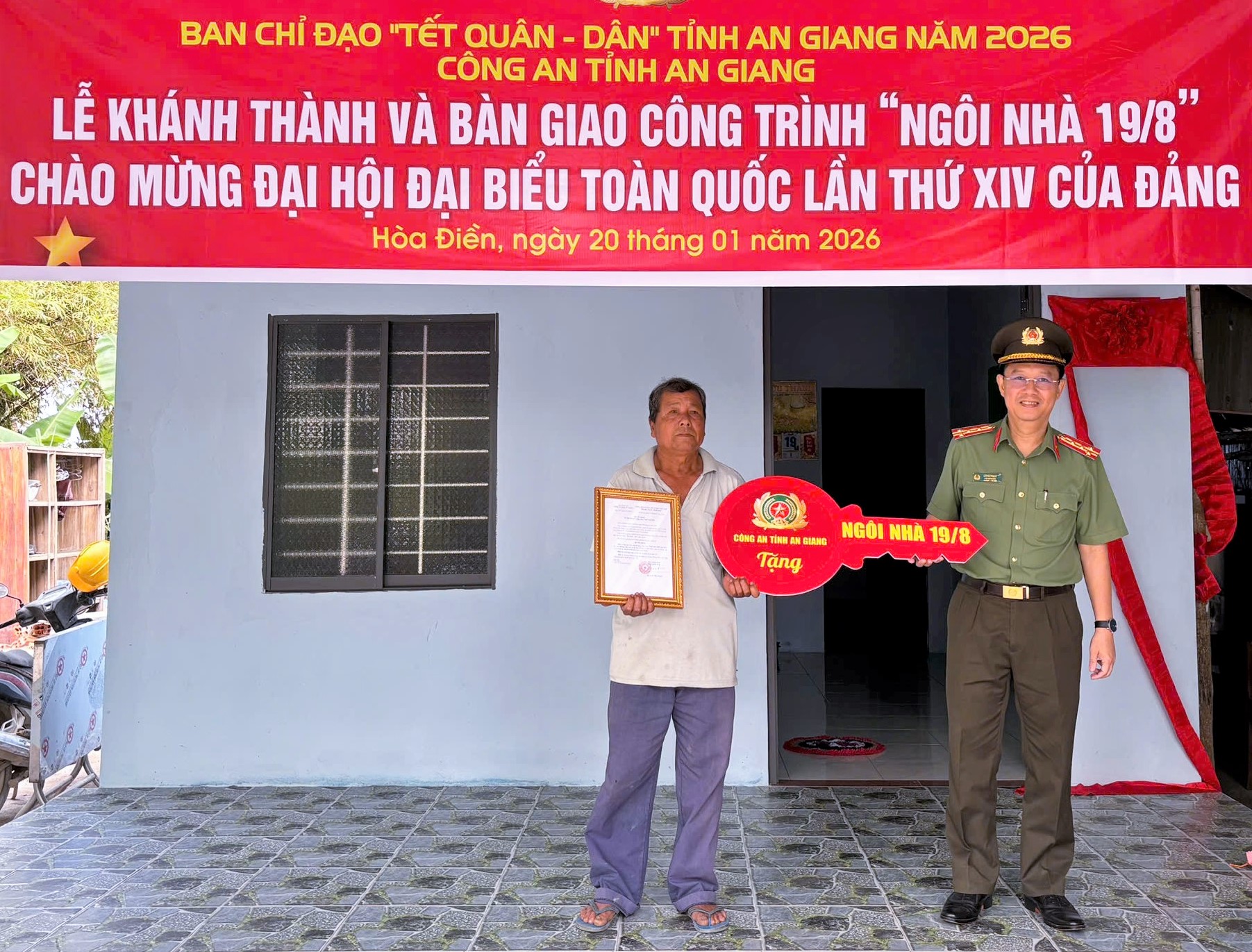 ‎Thiết thực chào mừng Đại hội đại biểu toàn quốc lần thứ XIV của Đảng, sáng ngày 20/01/2026, Công an tỉnh An Giang phối hợp UBND xã, Xã đoàn xã Hoà Điền tổ chức Lễ khánh thành và bàn giao công trình “Ngôi nhà 19/8” cho hộ ông Lê Văn Bé và ông Dương Núi, cư trú ấp Hòa Giang, xã Hòa Điền có hoàn cảnh khó khăn về nhà ở.