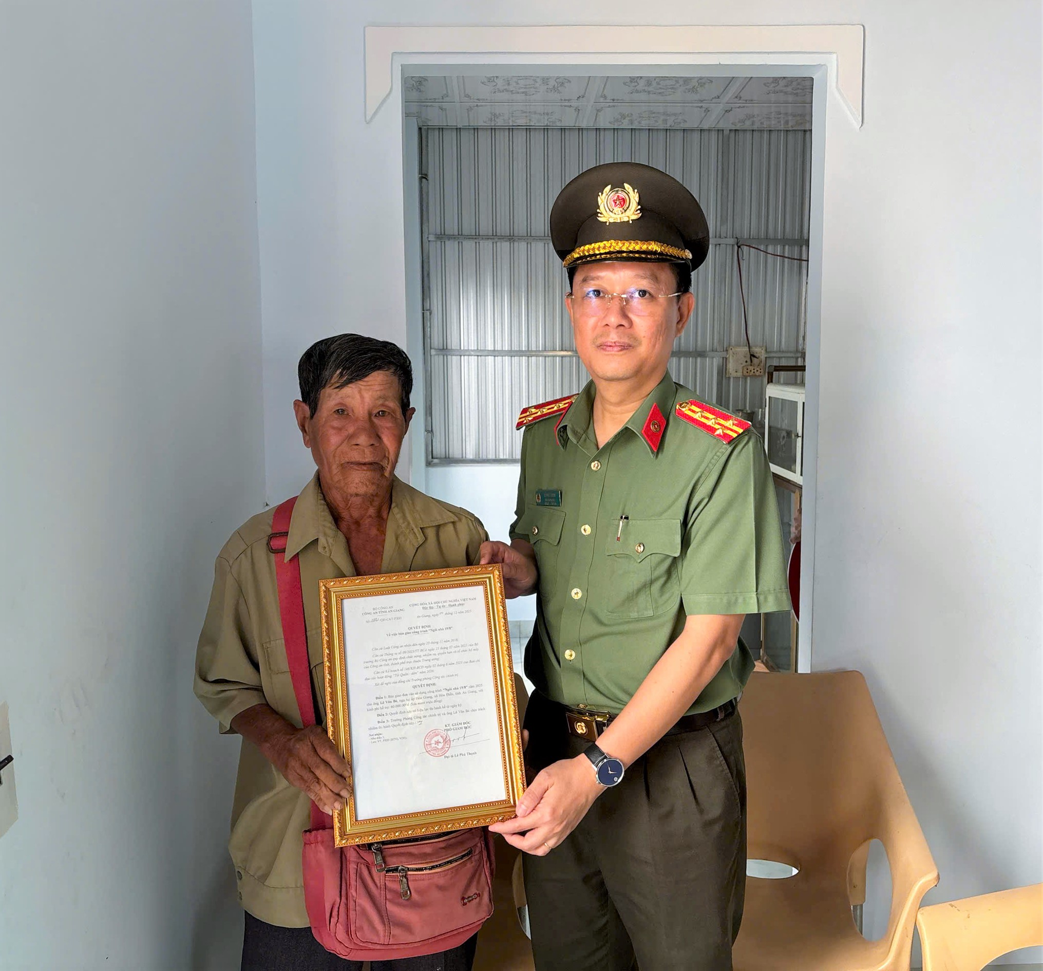 Đại tá Lê Phú Thạnh, Tỉnh uỷ viên, Phó Bí thư Đảng uỷ, Phó Giám đốc Công an tỉnh trao Quyết định bàn giao công trình “Ngôi nhà 19/8” và quà cho hộ ông Lê Văn Bé