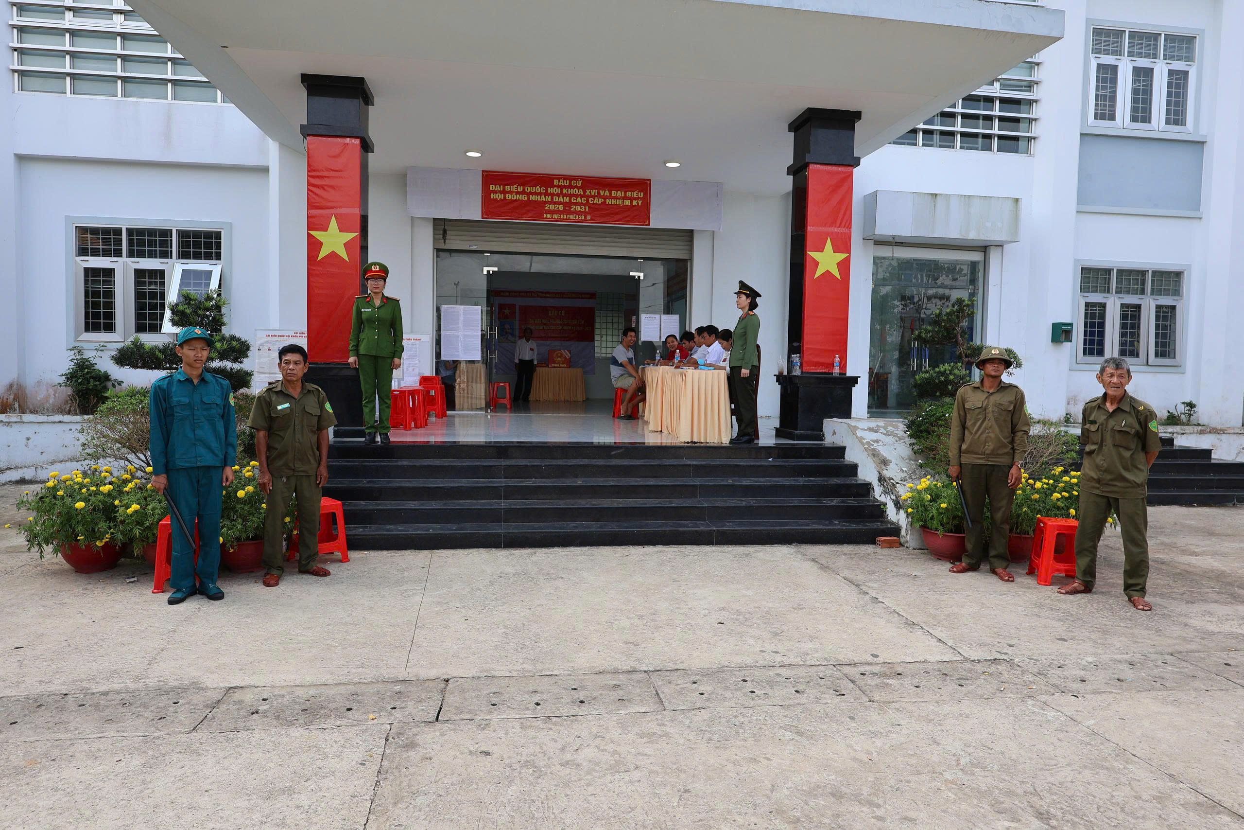 Lực lượng bảo đảm ANTT khu vực bỏ phiếu tại xã Tân Hiệp. - Ảnh: Thanh Hà.