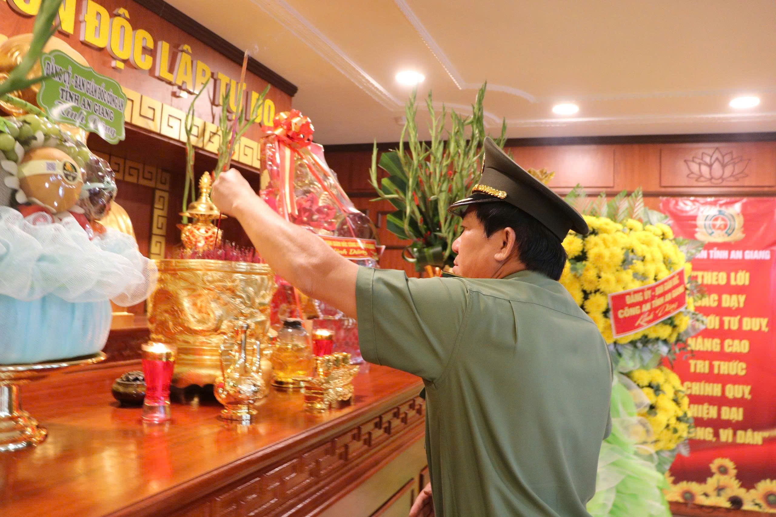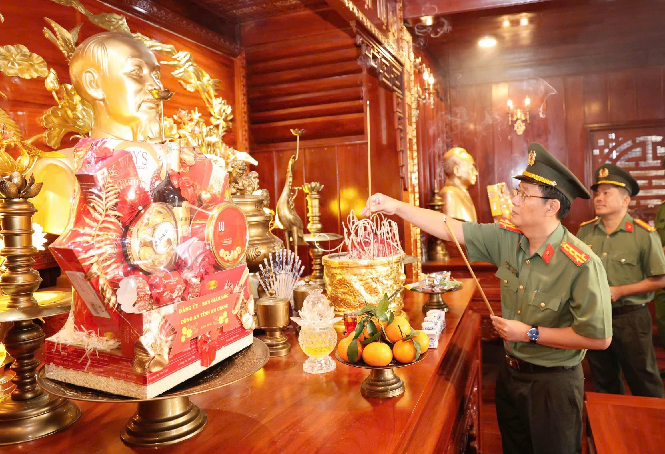 Cũng trong sáng cùng ngày, đoàn đã dâng hoa, dâng hương tại phòng thờ Chủ tịch Hồ Chí Minh ở trụ sở làm việc Công an tỉnh. Trước anh linh Bác Hồ kính yêu, Đảng ủy – Ban Giám đốc Công an tỉnh An Giang hứa tuyệt đối trung thành với Đảng, Nhà nước và Nhân dân; không ngừng tu dưỡng, rèn luyện phẩm chất đạo đức cách mạng theo tư tưởng, đạo đức, phong cách Hồ Chí Minh và Sáu điều Bác Hồ dạy Công an nhân dân; nêu cao trách nhiệm, giữ nghiêm kỷ luật, kỷ cương, đoàn kết thống nhất, phát huy truyền thống vẻ vang của lực lượng Công an nhân dân, quyết tâm xây dựng lực lượng thật sự trong sạch, vững mạnh, chính quy, tinh nhuệ, hiện đại, đáp ứng yêu cầu nhiệm vụ trong tình hình mới.