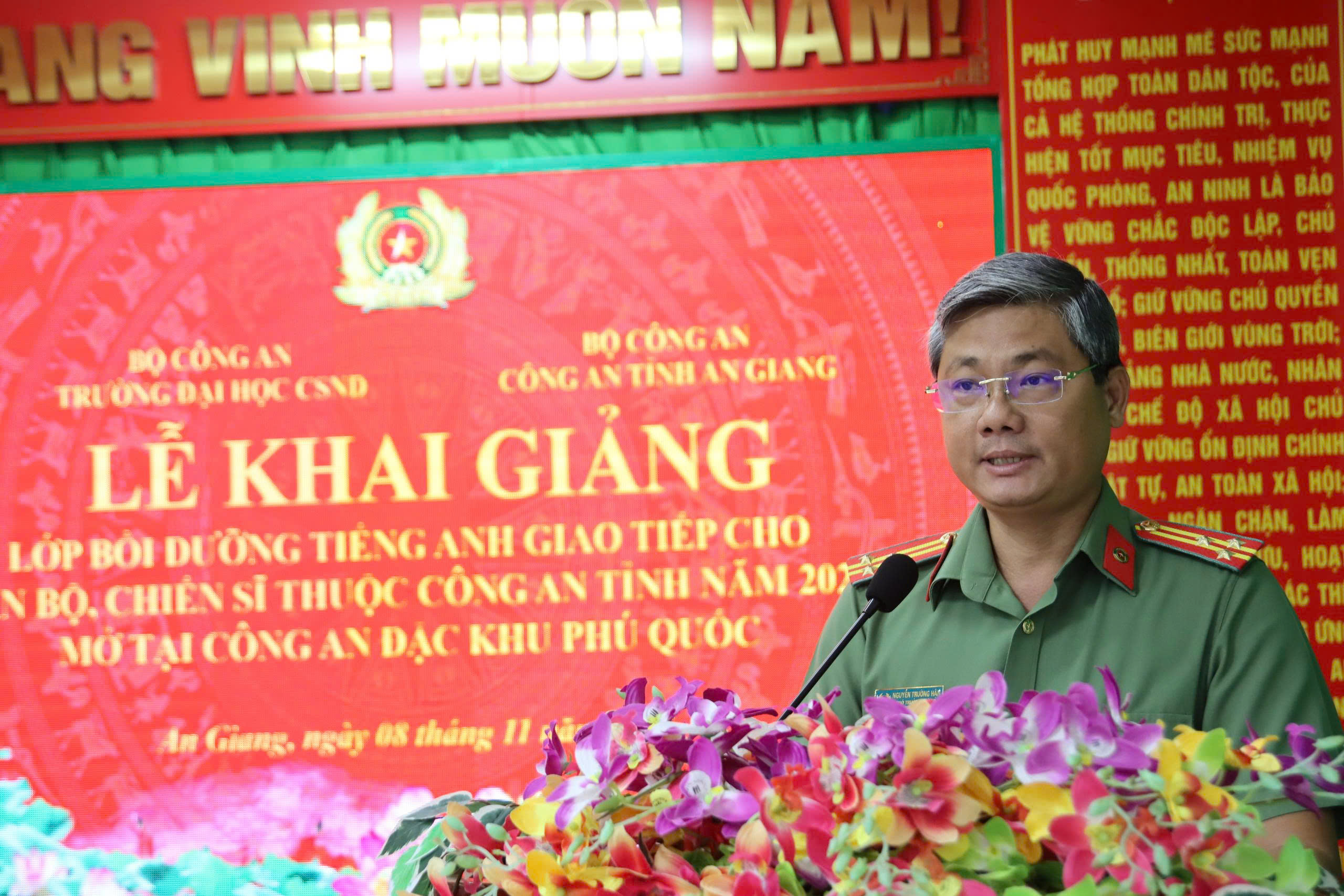 Phát biểu tại buổi lễ, Thượng tá Nguyễn Trường Hận nhấn mạnh tầm quan trọng của việc nâng cao trình độ ngoại ngữ cho cán bộ, chiến sĩ, nhất là tại các đơn vị thường xuyên tiếp xúc với người nước ngoài; qua đó phục vụ tốt công tác bảo đảm an ninh trật tự, hướng tới phục vụ Hội nghị APEC 2027 tại đặc khu Phú Quốc. Đồng thờig đề nghị học viên nêu cao tinh thần học tập, tích cực trao đổi với giảng viên, vận dụng hiệu quả kiến thức vào thực tiễn công tác.