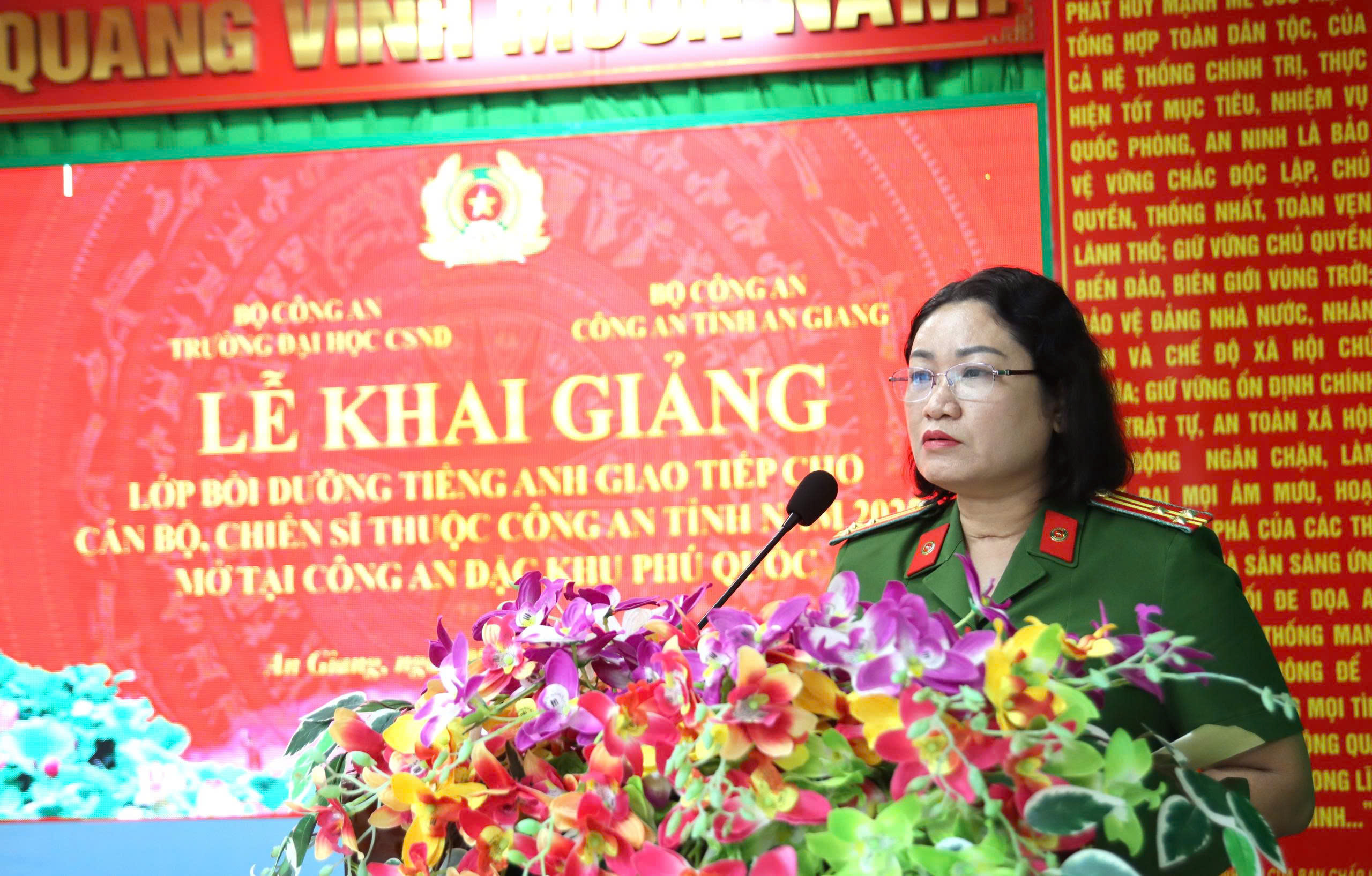 Phát biểu tại lễ khai giảng, Thượng tá Vũ Thị Cẩm Vân, Phó Giám đốc Trung tâm Giáo dục nghề nghiệp, Đào tạo lái xe, Ngoại ngữ, Tin học – Trường Đại học Cảnh sát nhân dân, nhấn mạnh: Việc tổ chức lớp bồi dưỡng tiếng Anh thể hiện sự quan tâm của lãnh đạo Công an tỉnh An Giang trong nâng cao trình độ ngoại ngữ cho cán bộ, chiến sĩ, đáp ứng yêu cầu công tác trong tình hình mới. Nhà trường cam kết tạo điều kiện tốt nhất về chương trình, giảng viên và phương pháp giảng dạy, giúp học viên nắm vững kiến thức, rèn luyện kỹ năng giao tiếp tiếng Anh trong các tình huống nghiệp vụ, góp phần xây dựng lực lượng Công an chính quy, tinh nhuệ, hiện đại.