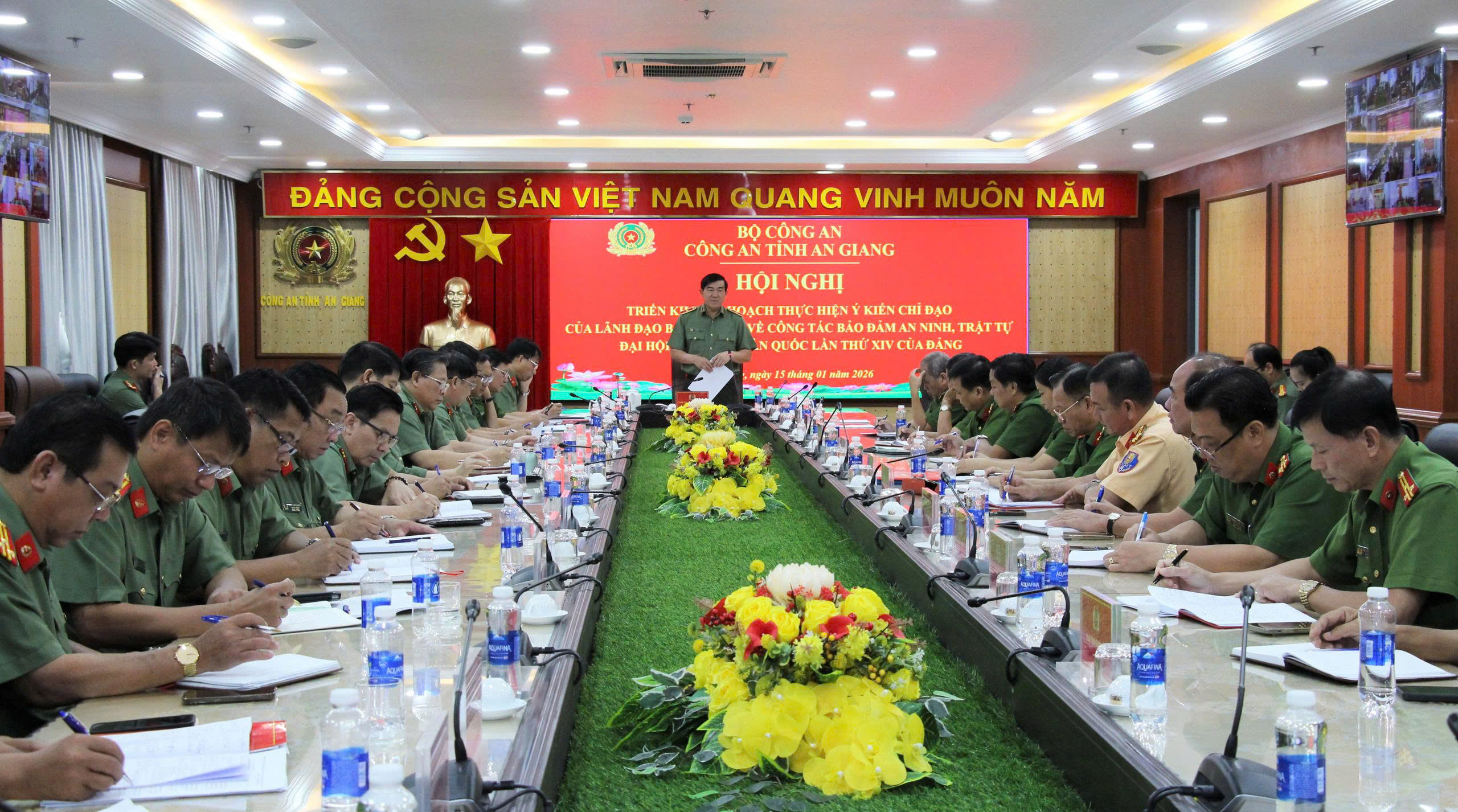 Quán triệt sâu sắc ý kiến chỉ đạo của đồng chí Thứ trưởng Bộ Công an, Công an tỉnh An Giang đã chủ động xây dựng kế hoạch và tổ chức triển khai thực hiện đồng bộ trong toàn lực lượng. Xác định đây là nhiệm vụ chính trị đặc biệt quan trọng, Công an tỉnh tập trung thực hiện các biện pháp bảo đảm ANTT ở cấp độ cao nhất; chủ động nắm chắc tình hình, quản lý chặt địa bàn, kịp thời phát hiện, đấu tranh, xử lý hiệu quả các yếu tố tiềm ẩn phức tạp; tăng cường công tác bảo đảm trật tự, an toàn giao thông, an ninh, an toàn không gian mạng; tạo môi trường ổn định, thuận lợi cho các hoạt động liên quan đến Đại hội, góp phần giữ vững ổn định chính trị, trật tự, an toàn xã hội trên địa bàn tỉnh.