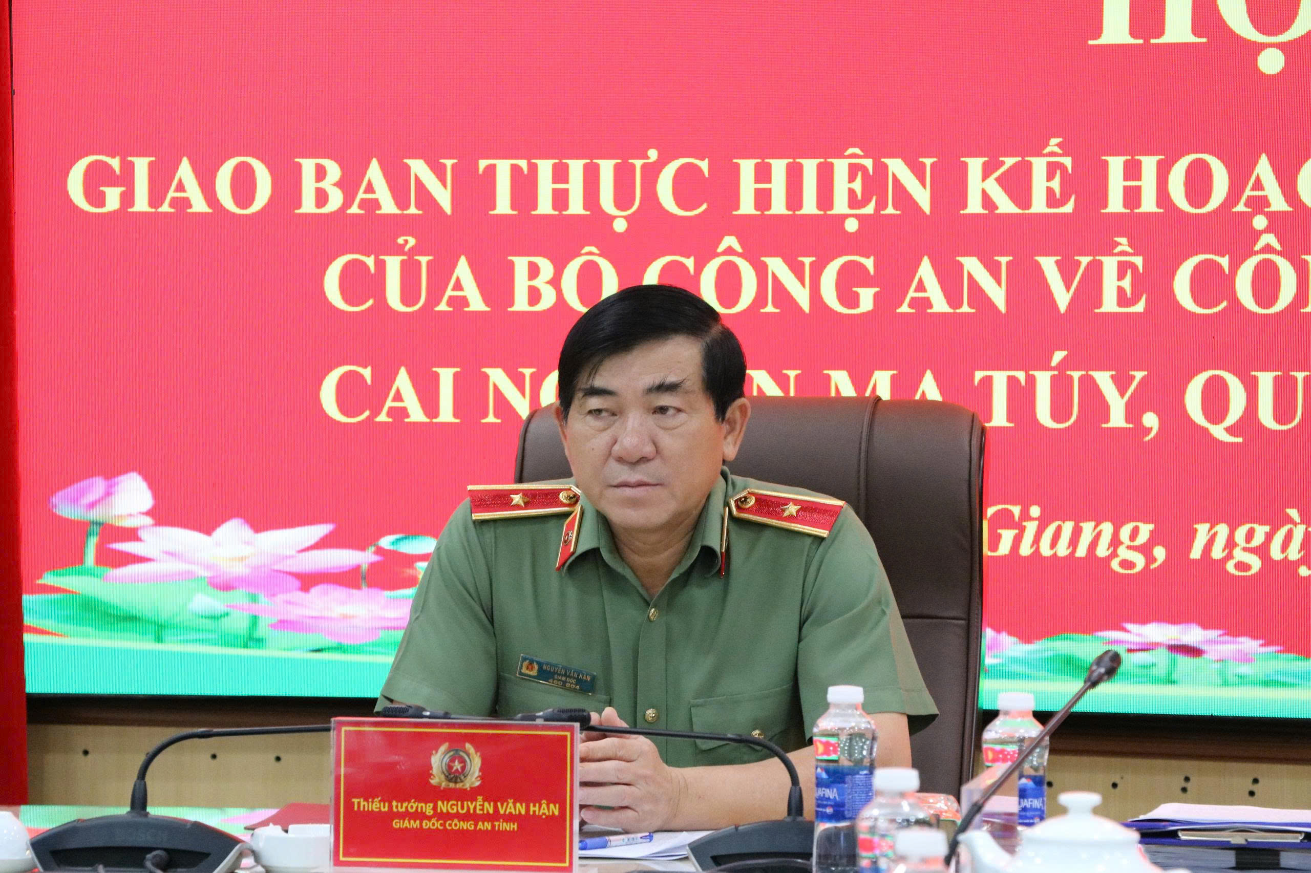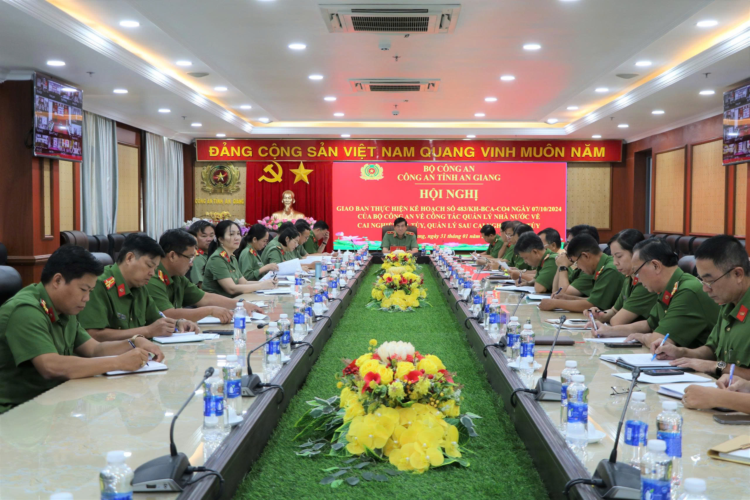 Sáng 31/01/2026, Bộ Công an tổ chức Hội nghị giao ban trực tuyến triển khai Kế hoạch số 483/KH-BCA-C04 về cao điểm tổng rà soát, quản lý người nghiện ma túy, người sử dụng trái phép chất ma túy, người bị quản lý sau cai; đồng thời đấu tranh, triệt xóa các điểm, tụ điểm phức tạp về ma túy và tăng cường công tác quản lý nhà nước về cai nghiện, quản lý sau cai nghiện ma túy. Hội nghị được tổ chức theo hình thức trực tiếp kết hợp trực tuyến, kết nối đến các điểm cầu Công an các tỉnh, thành phố trực thuộc Trung ương. Tại điểm cầu Công an tỉnh An Giang, đồng chí Thiếu tướng Nguyễn Văn Hận, Giám đốc Công an tỉnh chủ trì hội nghị, cùng dự có các đồng chí trong Ban Giám đốc và lãnh đạo các phòng nghiệp vụ.