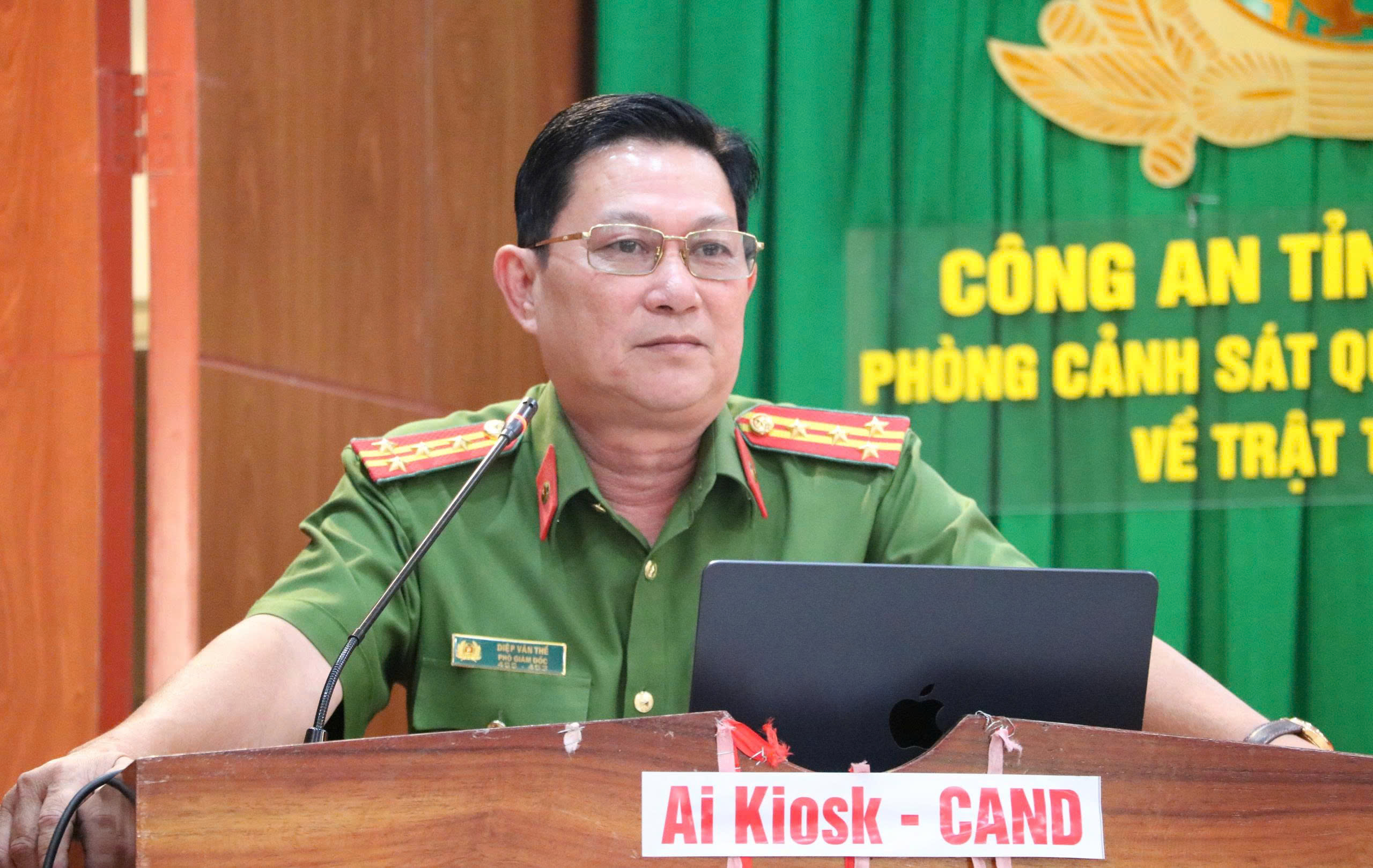 Đồng chí Đại tá Diệp Văn Thế, Phó Giám đốc Công an tỉnh phát biểu tại lễ triển khai thí điểm Kiosk phục vụ hành chính công