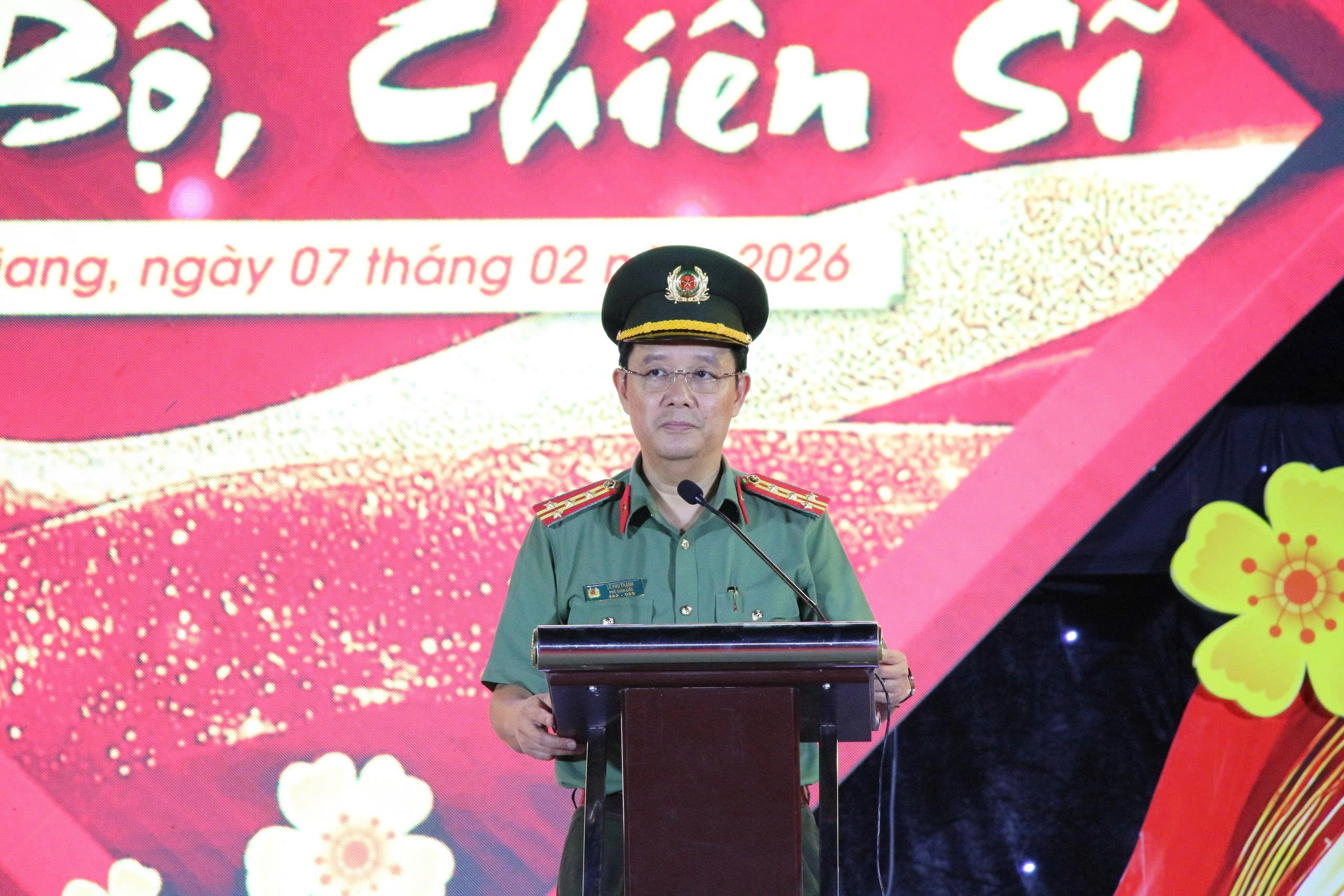 Phát biểu tại chương trình văn nghệ, thay mặt Đảng ủy – Giám đốc Công an tỉnh, Đại tá Lê Phú Thạnh gửi lời thăm hỏi ân cần, chúc mừng năm mới 2026 – Xuân Bính Ngọ đến các đại biểu, lãnh đạo Công an các đơn vị, Công an các xã, phường, đặc khu; cùng toàn thể cán bộ, chiến sĩ, lao động hợp đồng, cựu cán bộ Công an và lực lượng bảo vệ an ninh, trật tự ở cơ sở.