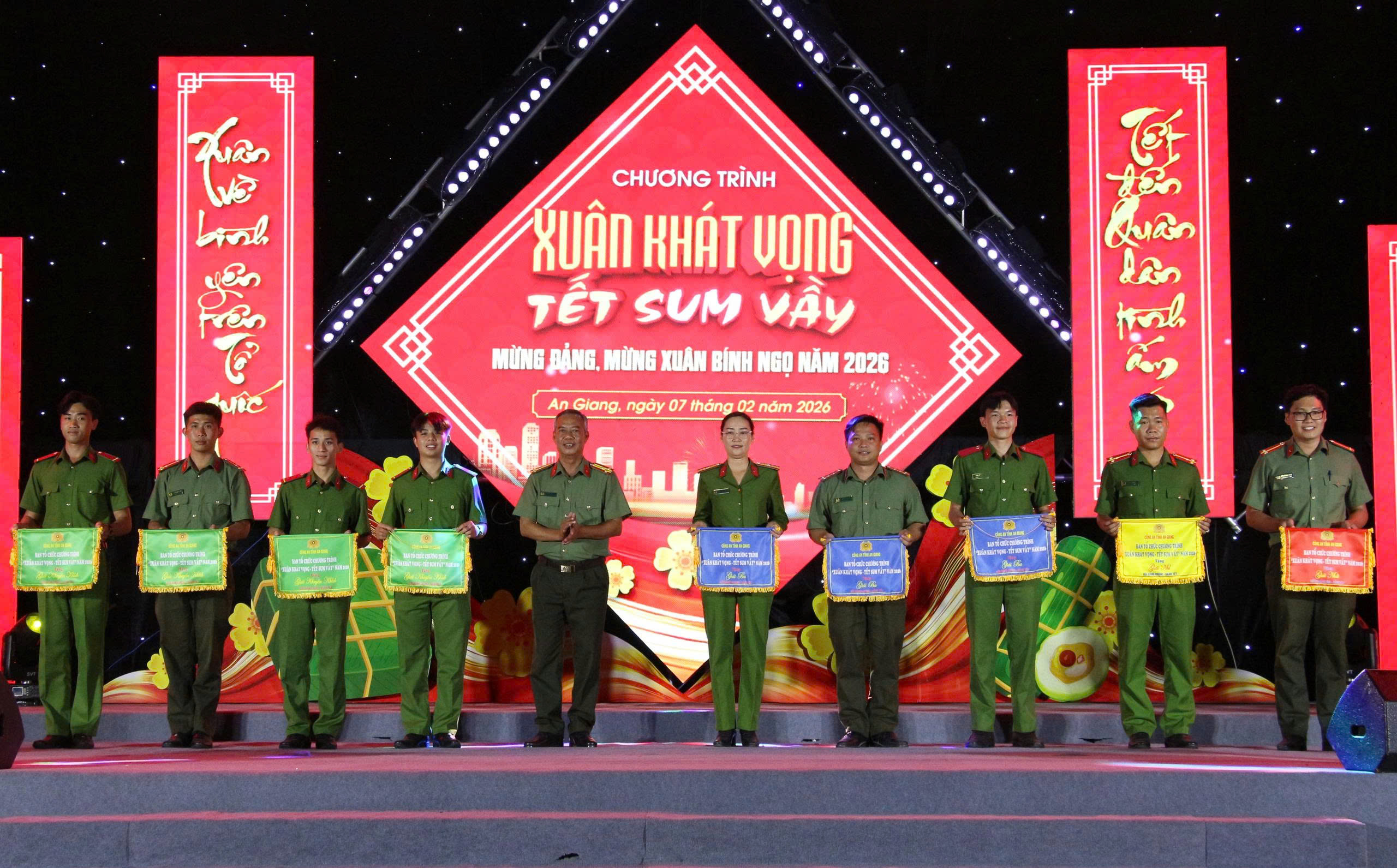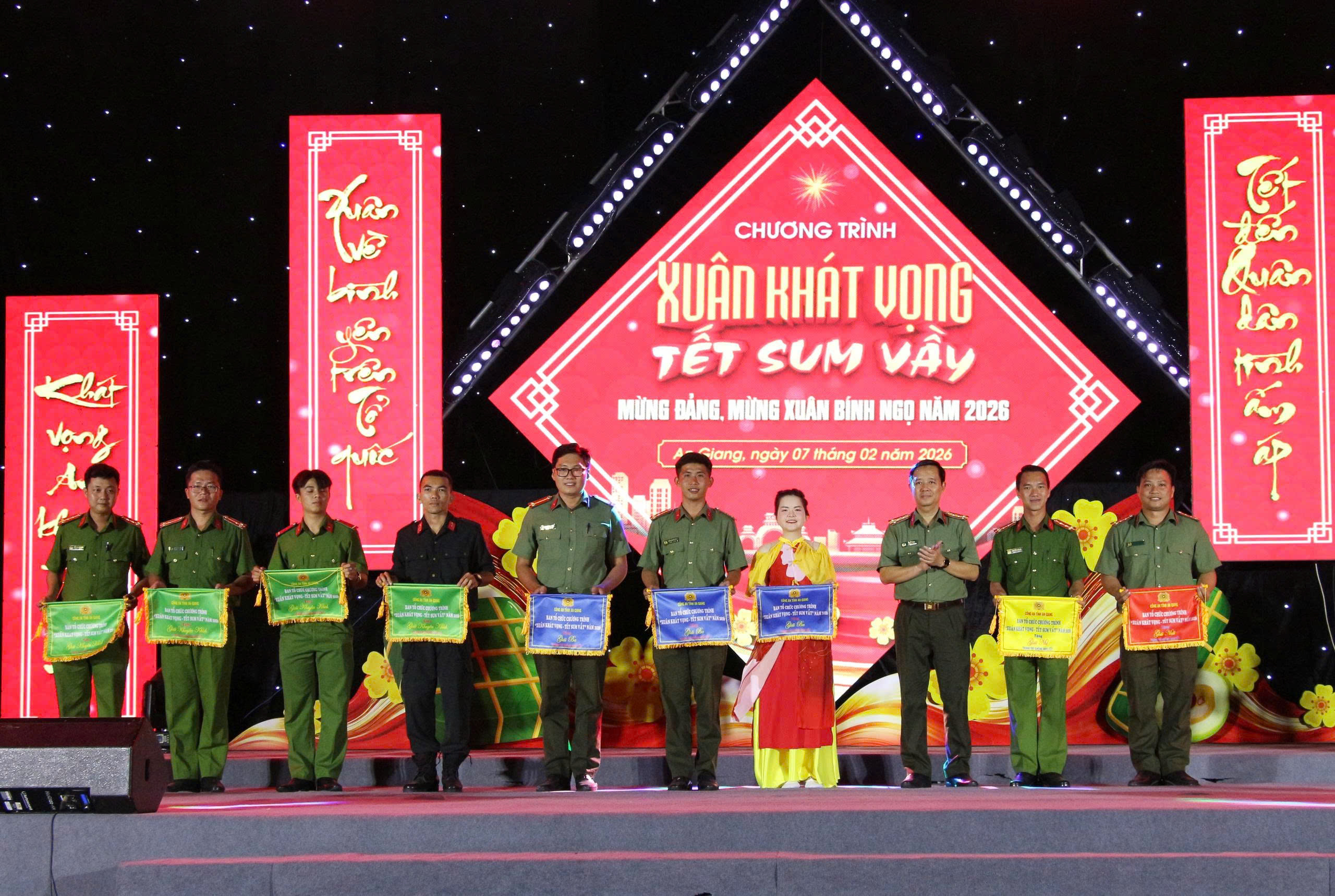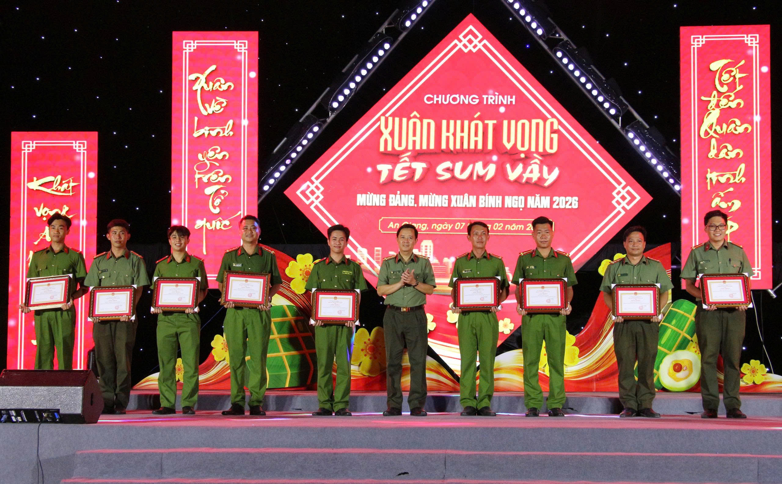 Nằm trong chuỗi hoạt động mừng Đảng, mừng xuân Bính Ngọ 2026, tối 07/02, Công an tỉnh An Giang tổ chức Chương trình văn nghệ “Xuân khát vọng – Tết sum vầy”. Đại tá Lê Phú Thạnh, Tỉnh ủy viên, Phó Giám đốc Công an tỉnh dự và chỉ đạo chương trình. Tham dự có bà Trương Thanh Thúy, Tỉnh ủy viên, Chủ tịch Hội Liên hiệp Phụ nữ tỉnh An Giang; ông Dư Phạm Hữu Khuyến, Phó Bí thư Tỉnh đoàn; Đại tá Lê Hoàng Dũng, Chủ tịch Hội Cựu CAND tỉnh An Giang, cùng lãnh đạo các phòng nghiệp vụ và đông đảo cán bộ, chiến sĩ.
