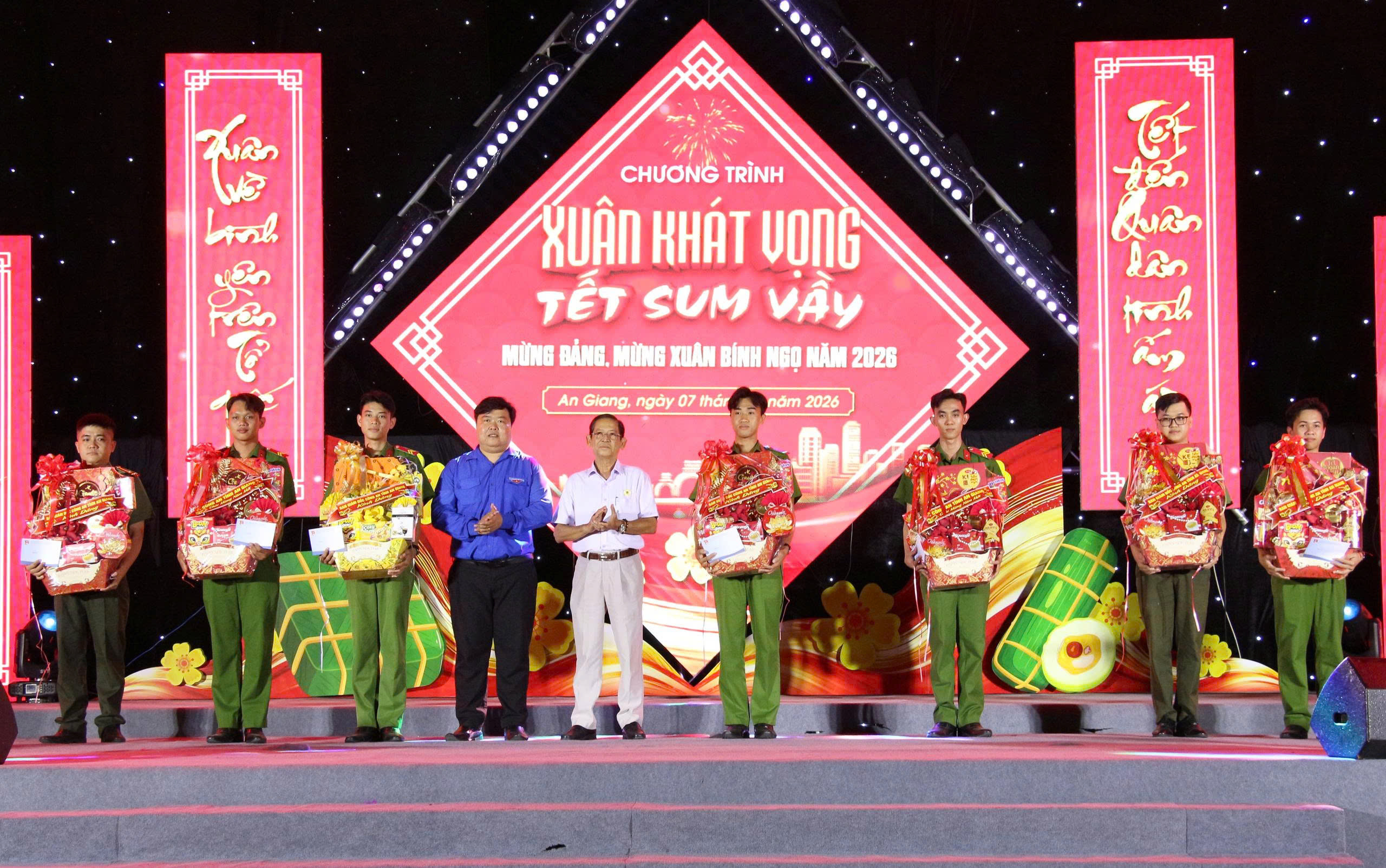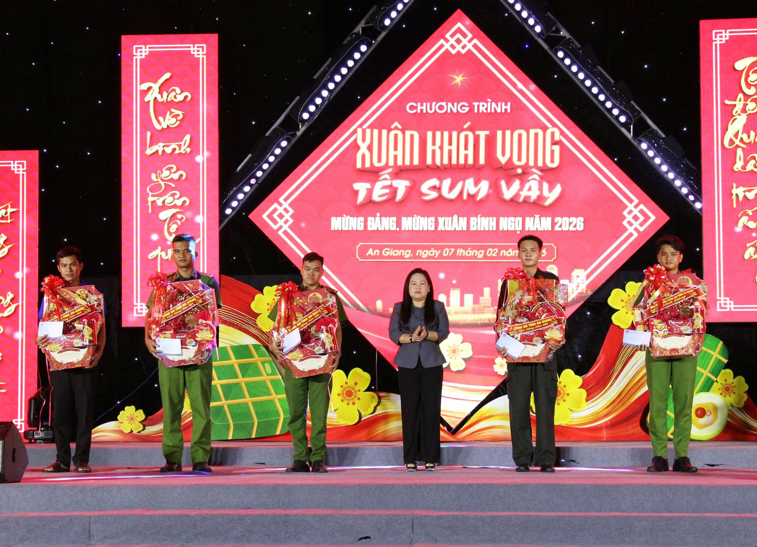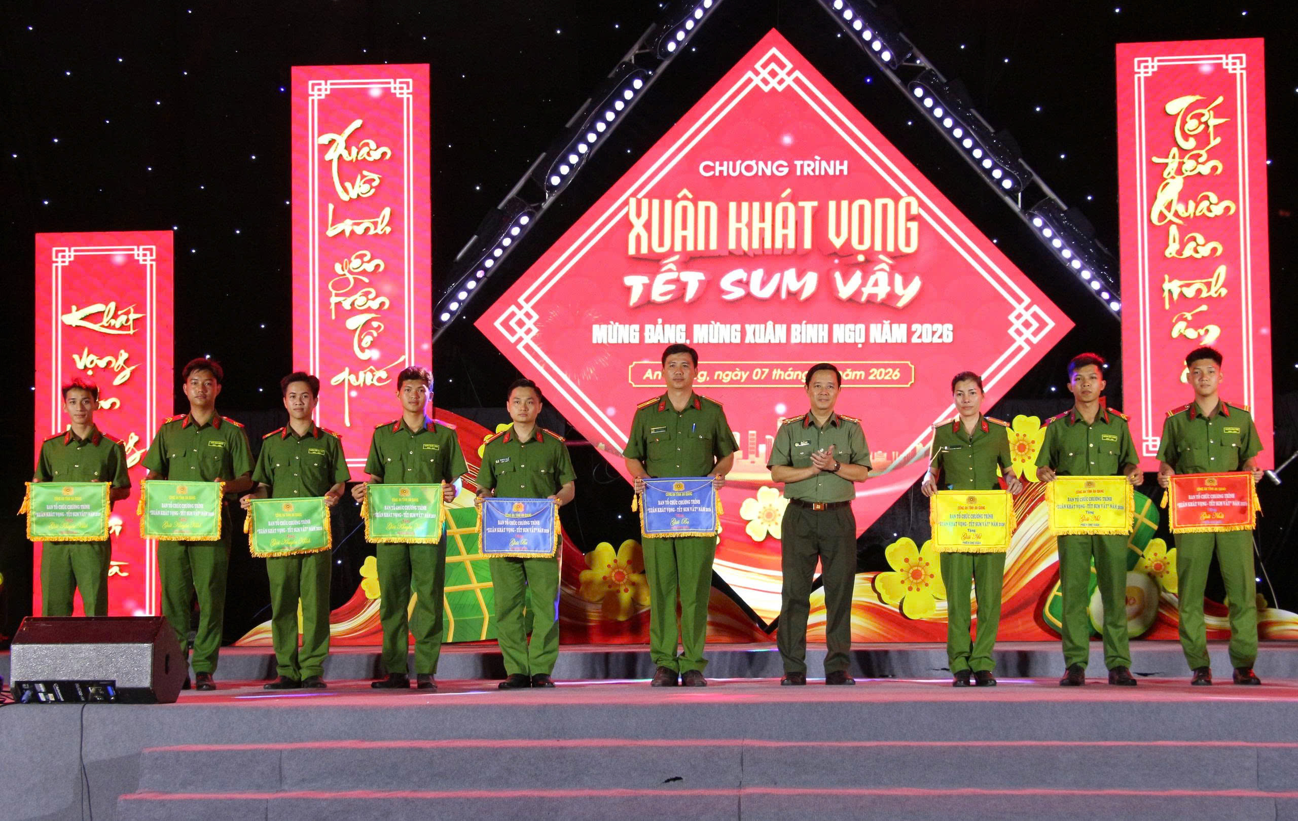 Nằm trong chuỗi hoạt động mừng Đảng, mừng xuân Bính Ngọ 2026, tối 07/02, Công an tỉnh An Giang tổ chức Chương trình văn nghệ “Xuân khát vọng – Tết sum vầy”. Đại tá Lê Phú Thạnh, Tỉnh ủy viên, Phó Giám đốc Công an tỉnh dự và chỉ đạo chương trình. Tham dự có bà Trương Thanh Thúy, Tỉnh ủy viên, Chủ tịch Hội Liên hiệp Phụ nữ tỉnh An Giang; ông Dư Phạm Hữu Khuyến, Phó Bí thư Tỉnh đoàn; Đại tá Lê Hoàng Dũng, Chủ tịch Hội Cựu CAND tỉnh An Giang, cùng lãnh đạo các phòng nghiệp vụ và đông đảo cán bộ, chiến sĩ.