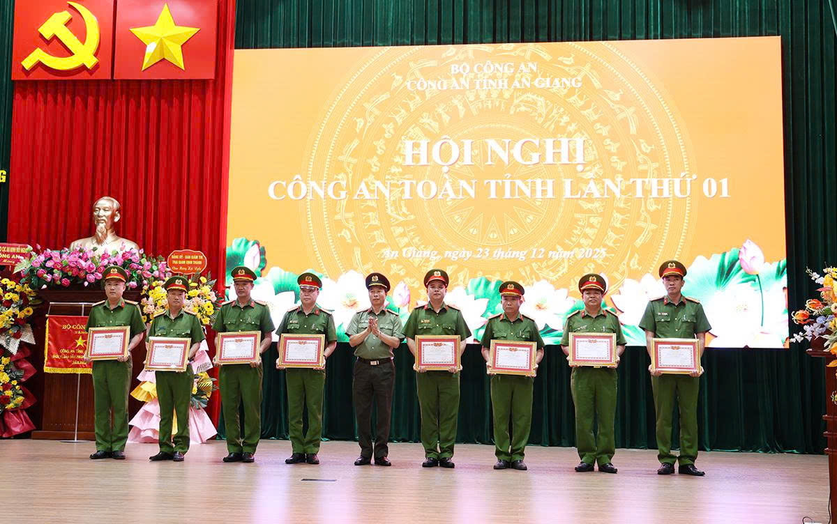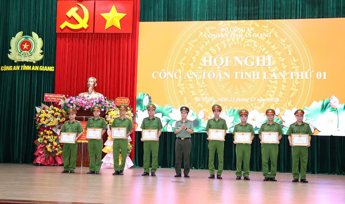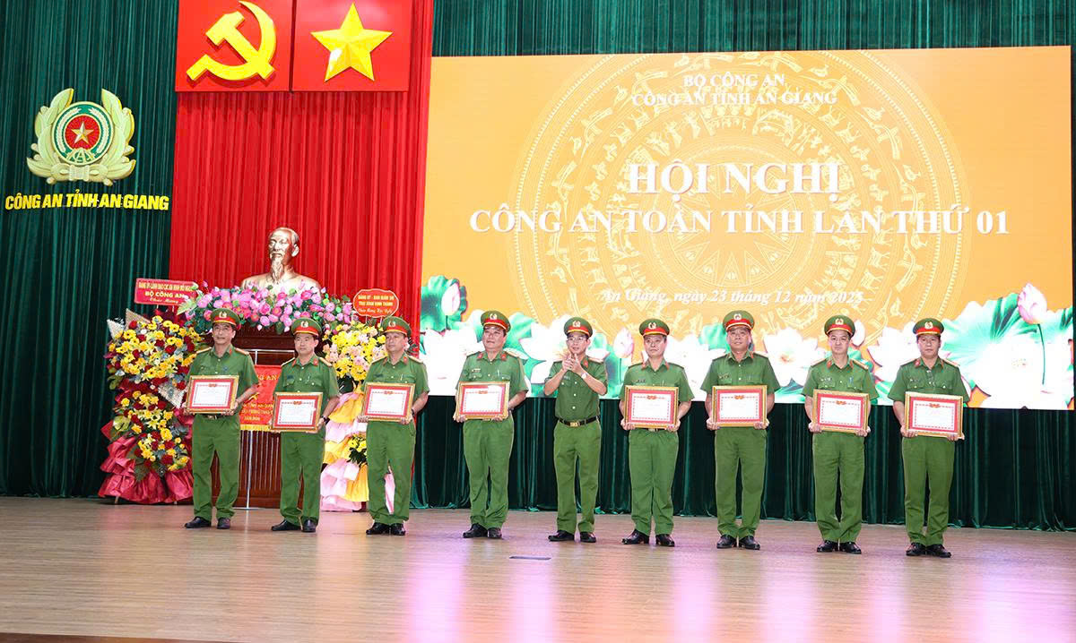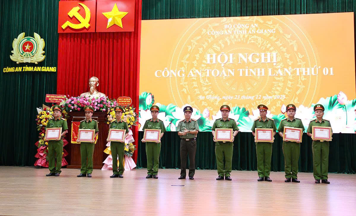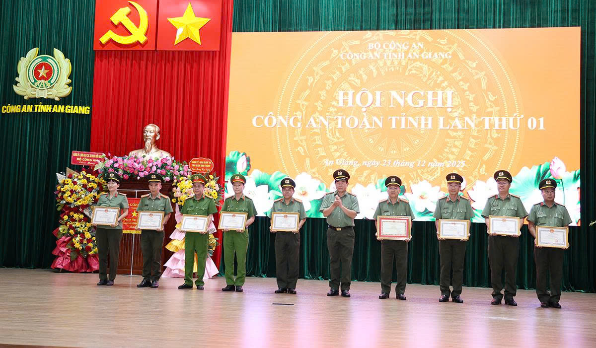 Dịp này, Thứ trưởng Phạm Thế Tùng đã trao tặng Cờ thi đua của Bộ Công an cho 14 đơn vị dẫn đầu các Cụm thi đua trực thuộc Công an tỉnh An Giang đã có thành tích xuất sắc trong phong trào thi đua “Vì an ninh Tổ quốc” năm 2025 và trao danh hiệu chiến sĩ thi đua toàn lực lượng cho 02 cá nhân thuộc Công an tỉnh An Giang; Bộ Công an tặng Bằng khen cho 02 tập thể, 03 cá nhân; Chủ tịch UBND tỉnh An Giang tặng Bằng khen cho 6 tập thể, 17 cá nhân vì có thành tích xuất sắc trong công tác và chiến đấu; Giám đốc Công an tỉnh tặng danh hiệu “Đơn vị quyết thắng” cho 65 đơn vị cấp phòng và Công an cấp xã đã có thành tích xuất sắc trong phong trào thi đua “Vì an ninh Tổ quốc” năm 2025.